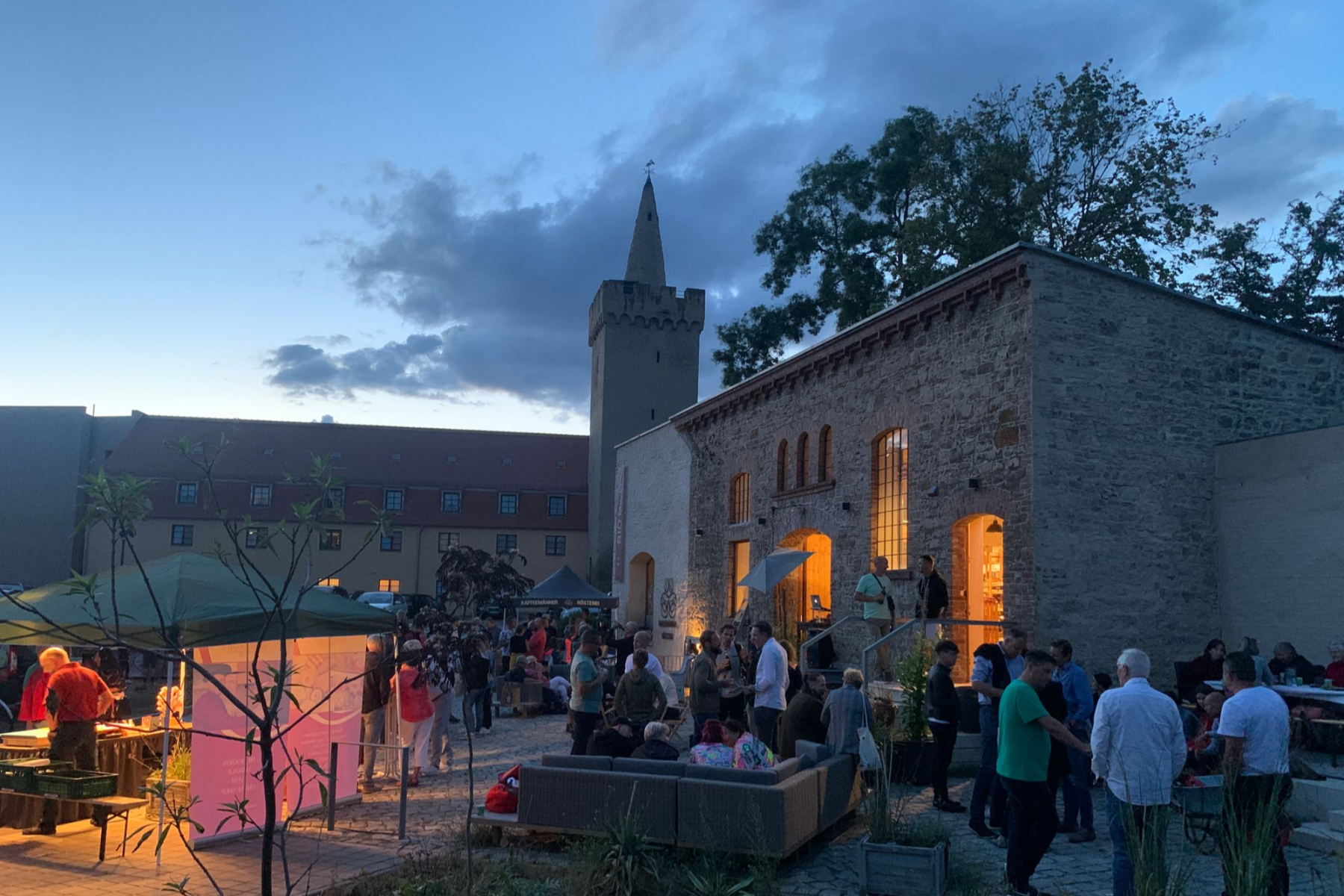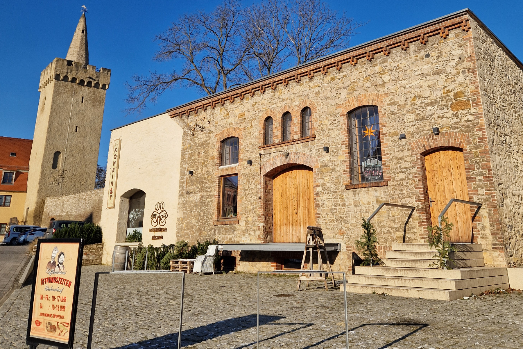 Am Längsten Verkostungstisch verweilen oder den Blick auf Rabenturm genießen