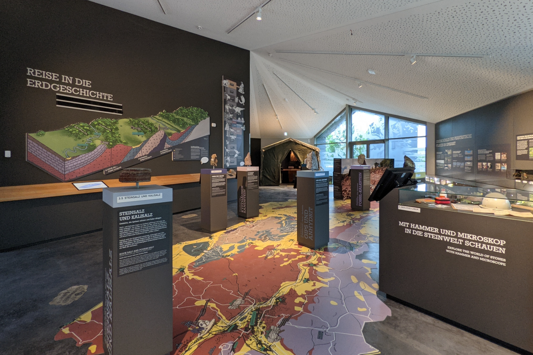 Die vielfältigen geowissenschaftlichen Zusammenhänge werden den Besuchern in der neuen Ausstellung jedoch nicht staubtrocken, sondern auf sehr kurzweilige Art und Weise nähergebracht. Sie beinhaltet nämlich eine interessante Kombination von multimedialen und echten Objekten. So kann man zum Beispiel per Touchscreen durch die Erdzeitalter reisen, aber auch im Archäologen-Zelt über ein Telefon mit Wählscheibe Wissenswertes zu verschiedenen Ausgrabungen erfahren. Zudem zeigen sieben Gesteinssäulen die vorkommenden Gesteinsarten, deren Entstehung und Verwendung.