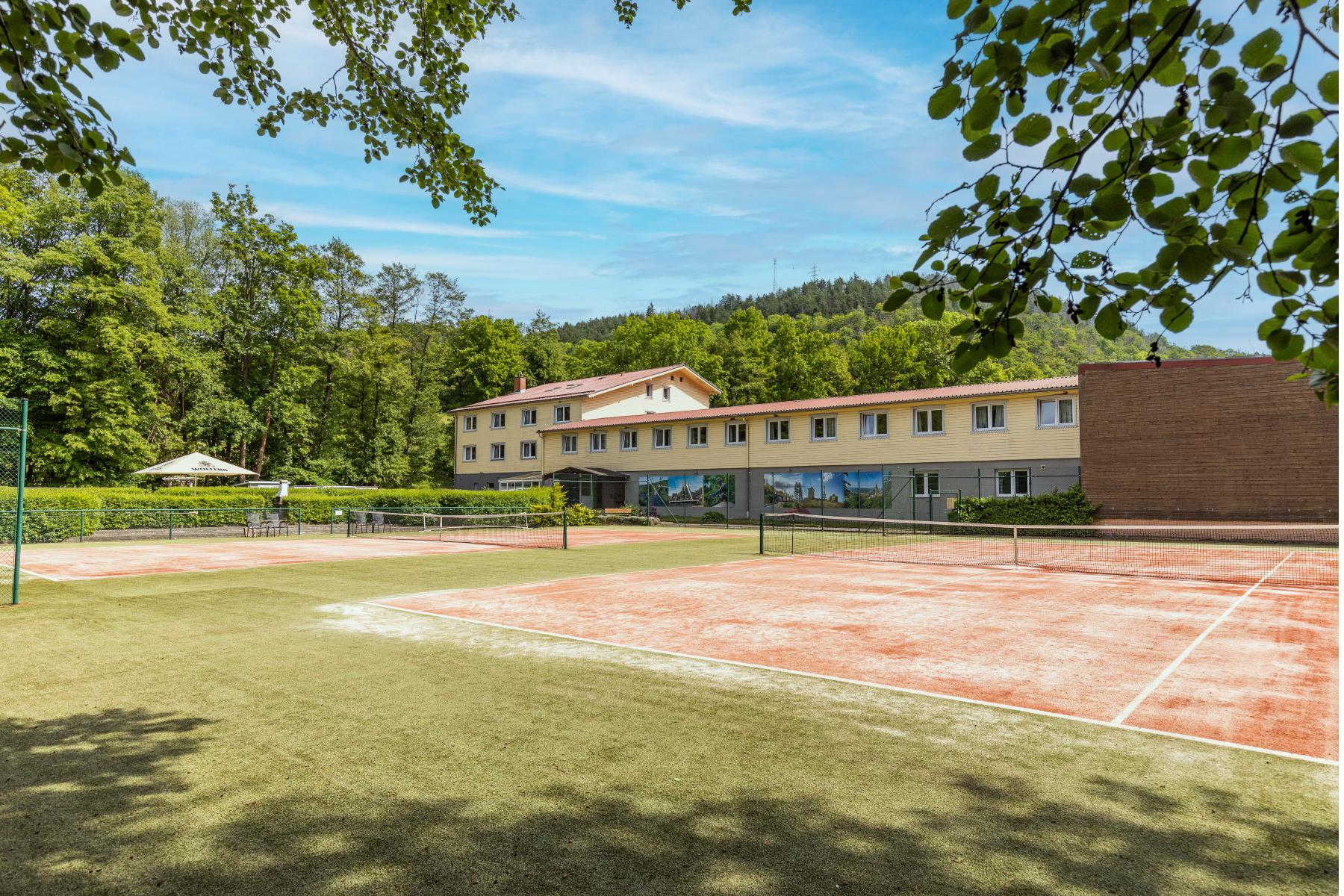 Der Outdoor-Sportplatz am Sporthotel Wernigerode ist ein idealer Spot für alle, die Sport, Natur und Harz-Urlaub miteinander verbinden möchten. Am Rand der bunten Stadt Wernigerode, idyllisch im grünen Mühlental gelegen, bietet die Anlage beste Bedingungen für Bewegung an der frischen Harzer Luft. Besonders beliebt sind die zwei gepflegten Tennisplätze im Außenbereich, auf denen Freizeitspieler und Sportbegeisterte eine entspannte Partie Tennis genießen können. Umgeben von Natur entsteht hier eine ruhige Atmosphäre, die perfekt zu einem aktiven Tag im Harz passt.