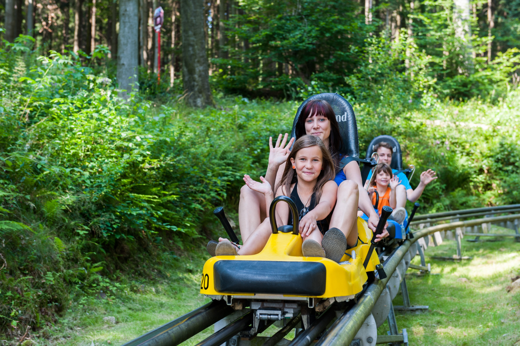 Für Senioren geeignetMit fliegenden Haaren geht´s mit dem Bob auf der kurvenreichen Strecke talwärts durch den Sagenwald.