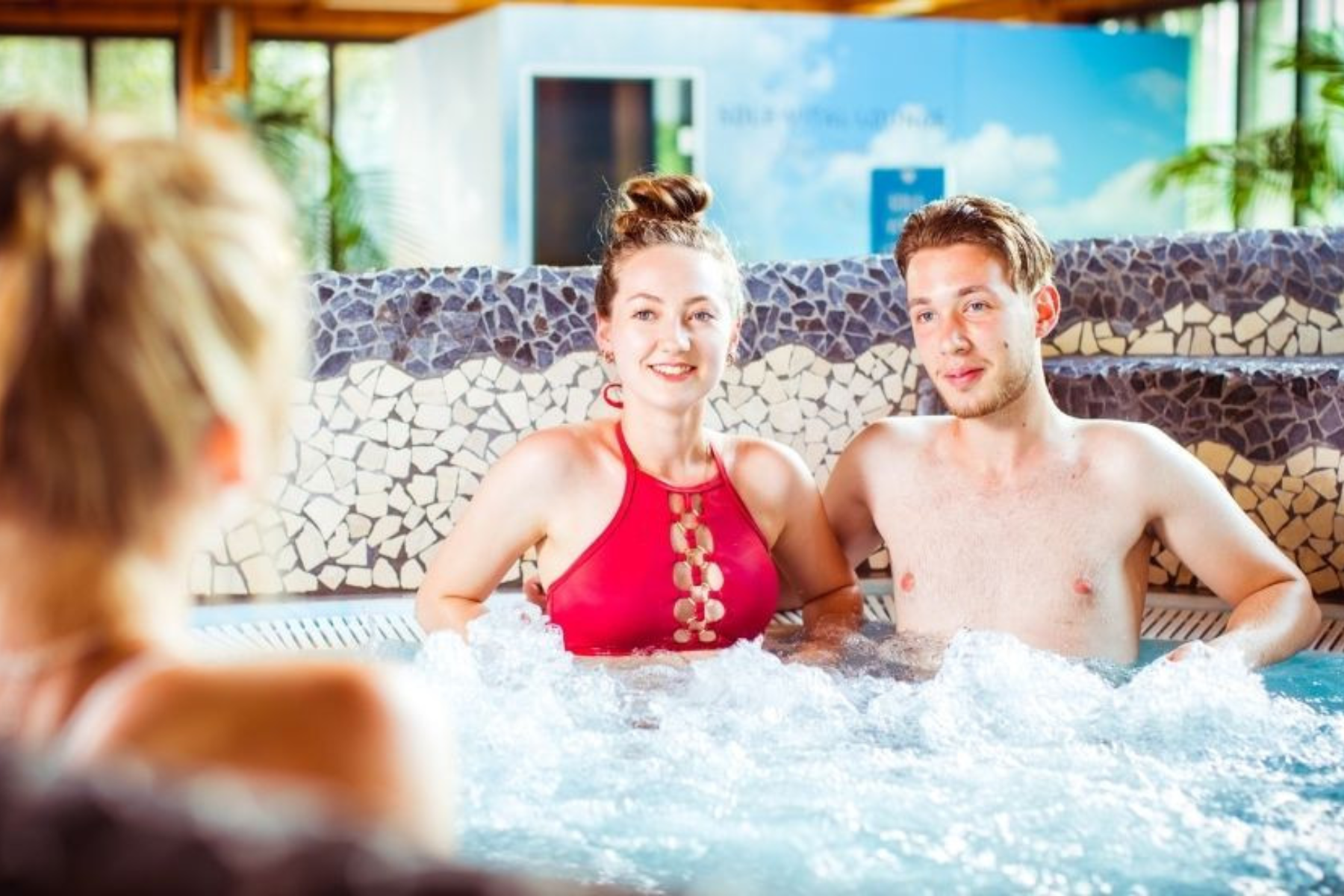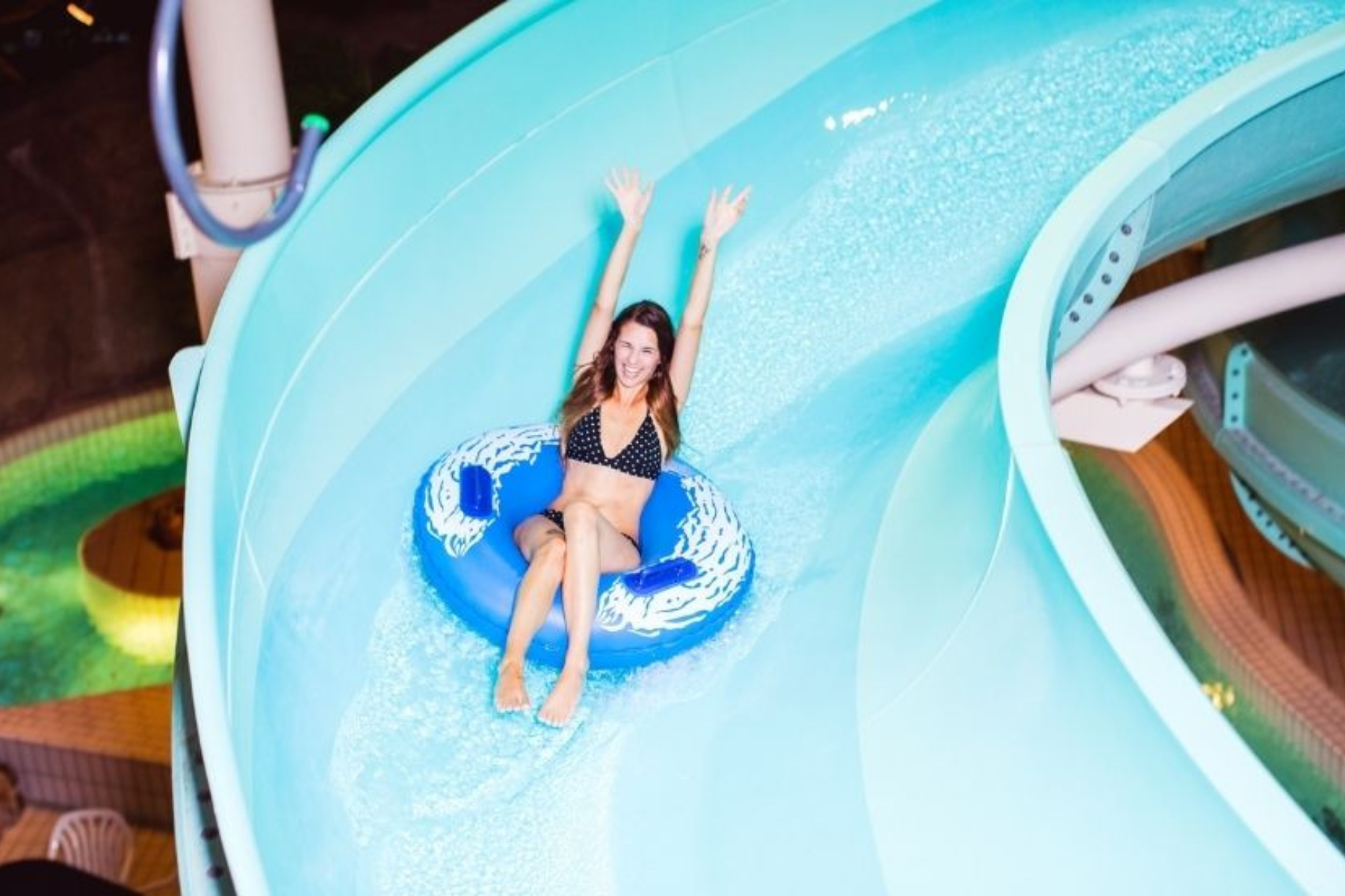 Mit einer 5.000m² großen Badelandschaft mit 95m Reifenrutsche, Innen- und Außenschwimmbecken, Wellenbecken, Kinderbadelandschaft, Strömungs- und Wildwasserkanal, Sportbecken, Riesenwhirlpools,