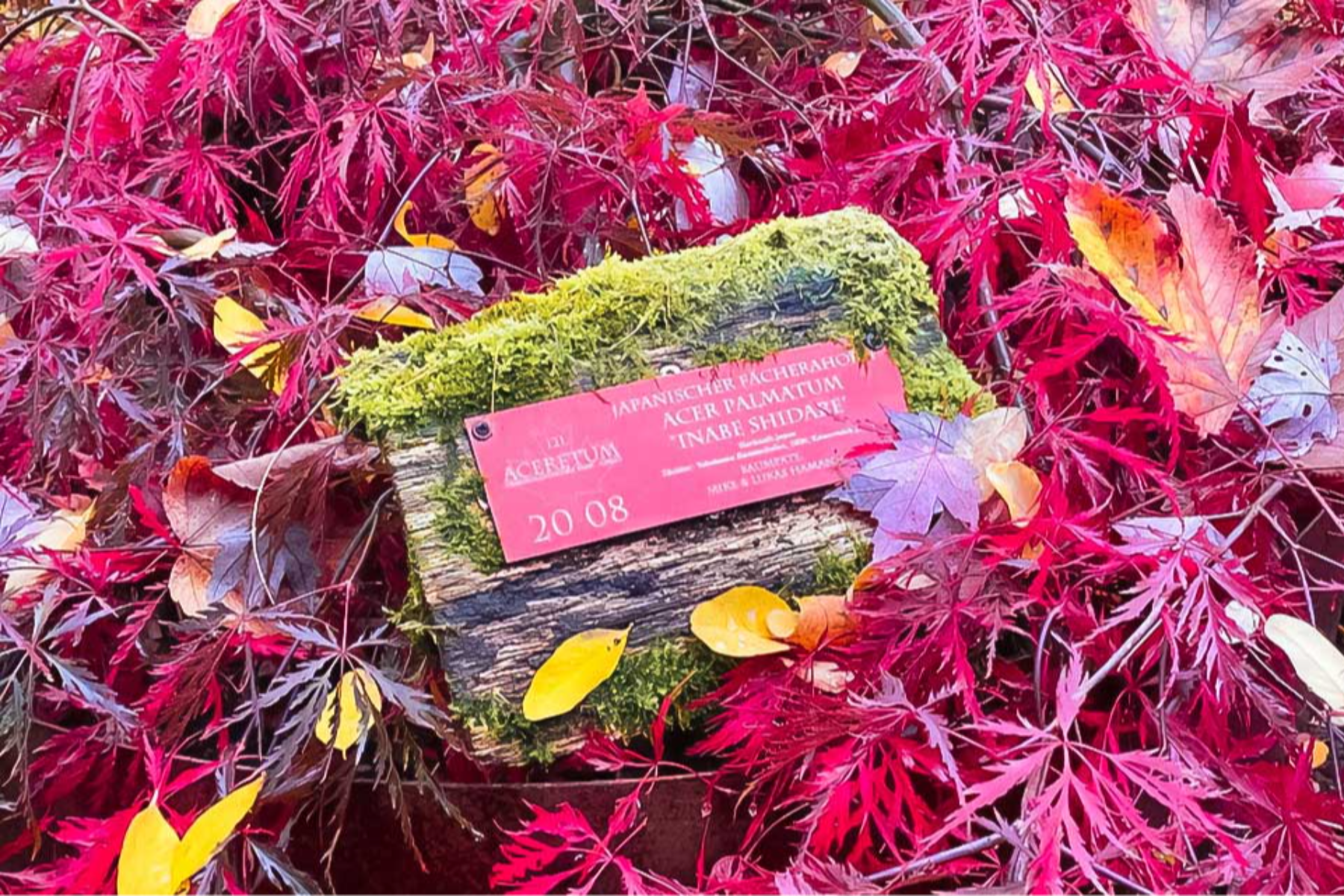 Red torii, Japanese gates that mark the entrance to sacred sites, point the way into the park from afar. Everyone who entered the maple park for the first time was enchanted by the variety and beauty of the trees. Each maple had a tree sponsor, and the botanical names, places of origin, years of planting and dedications could be read on small signs. It was an adventure to discover the little red signs and learn more about the inhabitants of this fairytale forest.