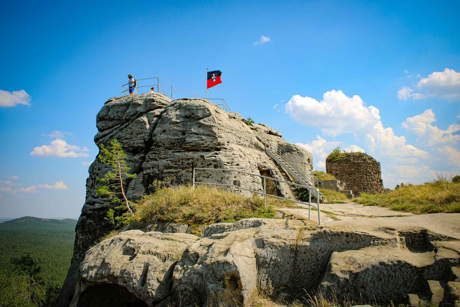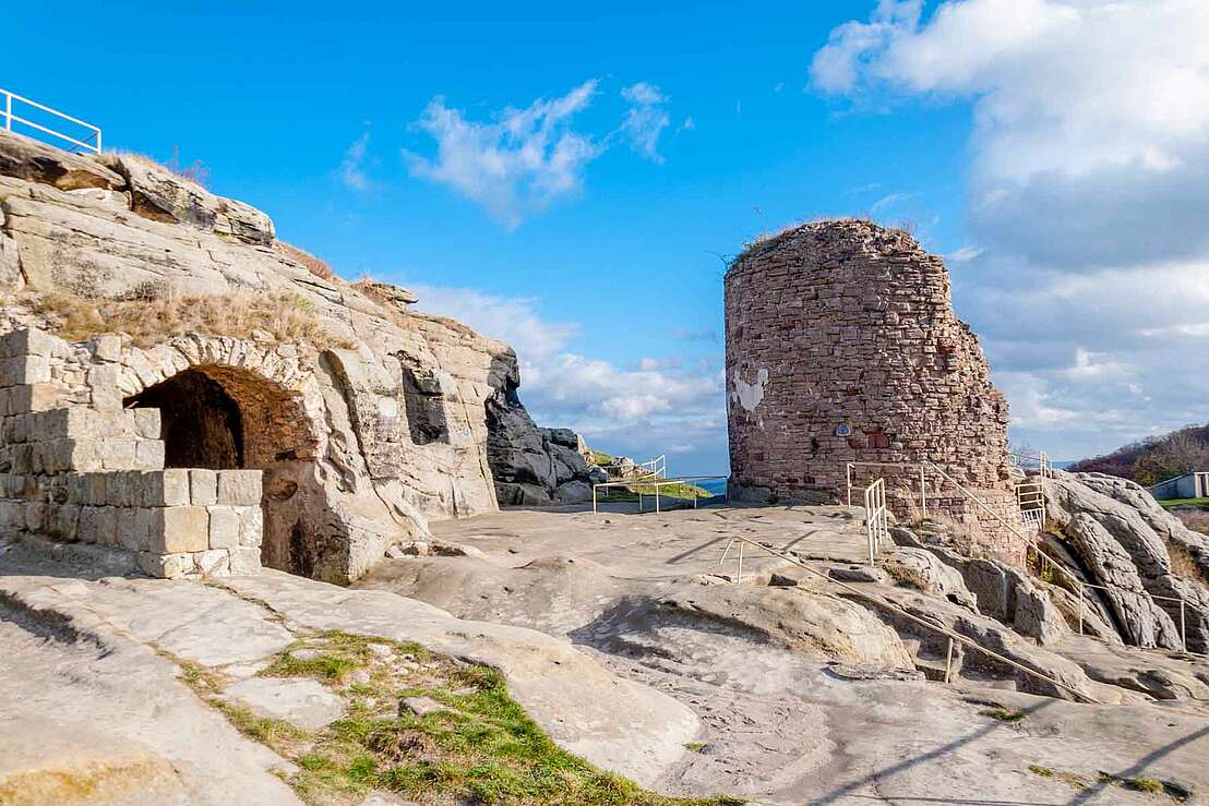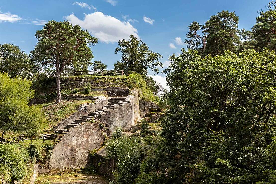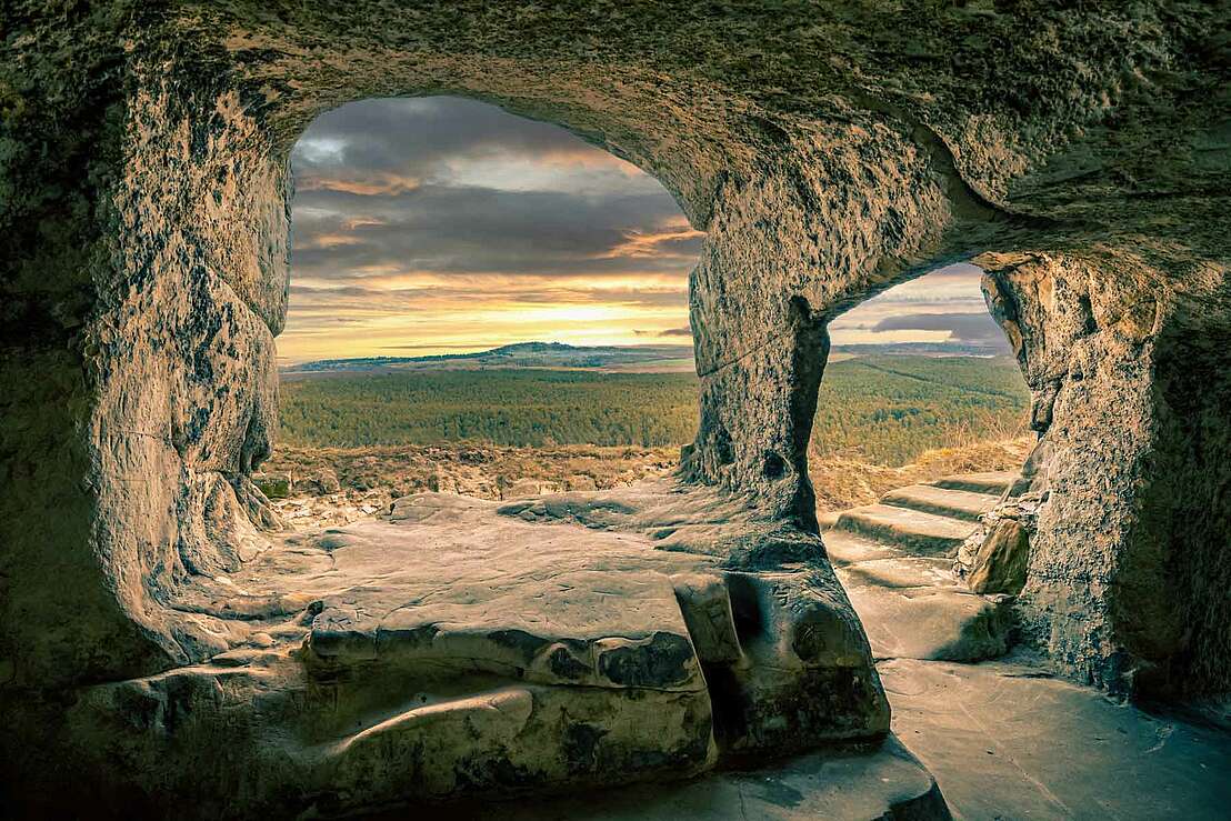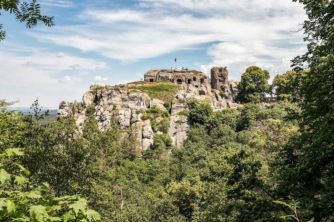 The ruins of Regenstein Castle are enthroned on a large sandstone rock near Blankenburg in the Harz Mountains, surrounded by numerous artificial rock caves that were created in the Middle Ages and have survived all the battles surrounding the castle. The castle extends over a 2.5 kilometre long and up to 295 metre high sandstone formation, which dates back to the Cretaceous period. Finds from the Stone Age, Bronze Age and Iron Age bear witness to the use of the rock barrier in prehistoric times. However, it is still not clear whether it was used as a place of worship or a dwelling.