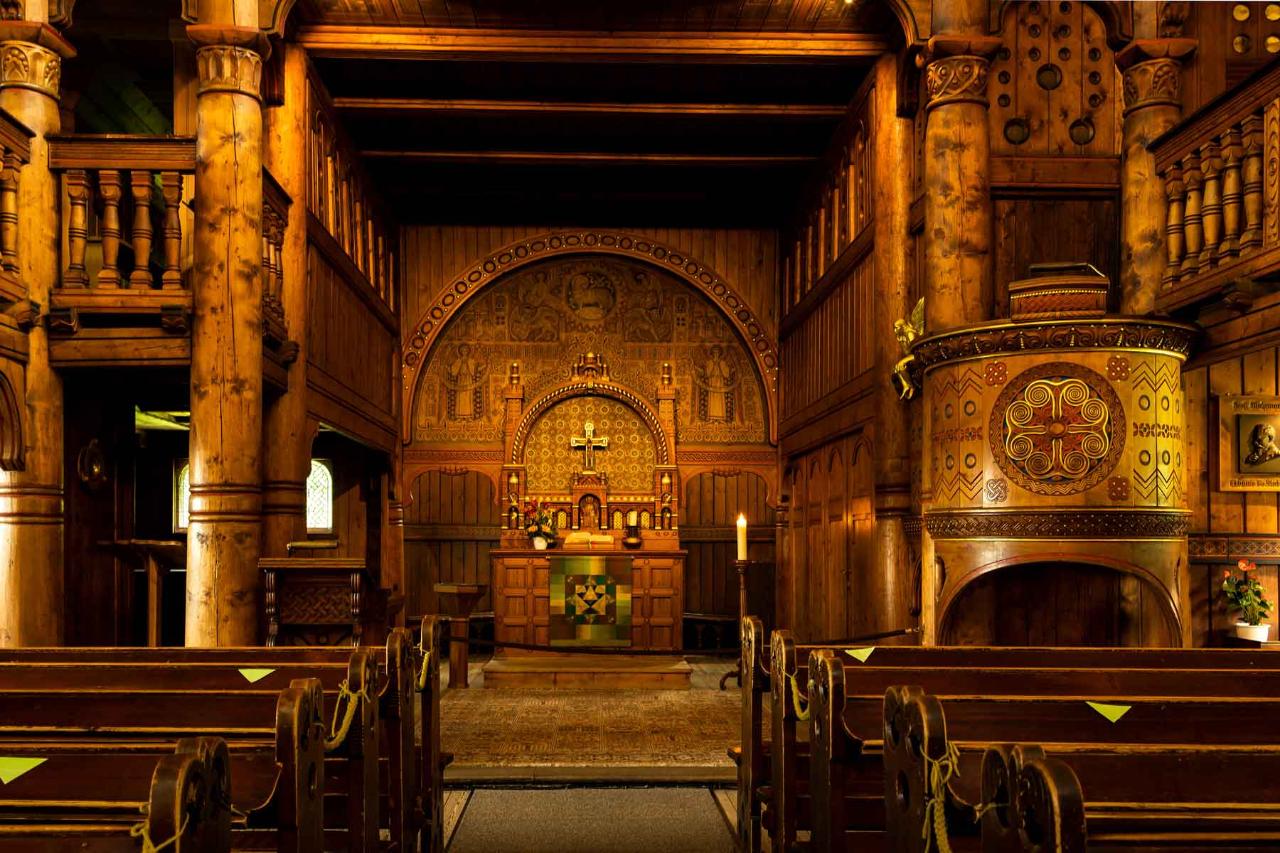 Like the building, the interior is made entirely of wood. Pagan symbols such as snakes and dragons recall the time of Christianisation. Both the windows, which are reminiscent of portholes, and the wooden chandelier on the ceiling, which is a replica of a ship's steering wheel, create a link to shipbuilding in the Viking era.
