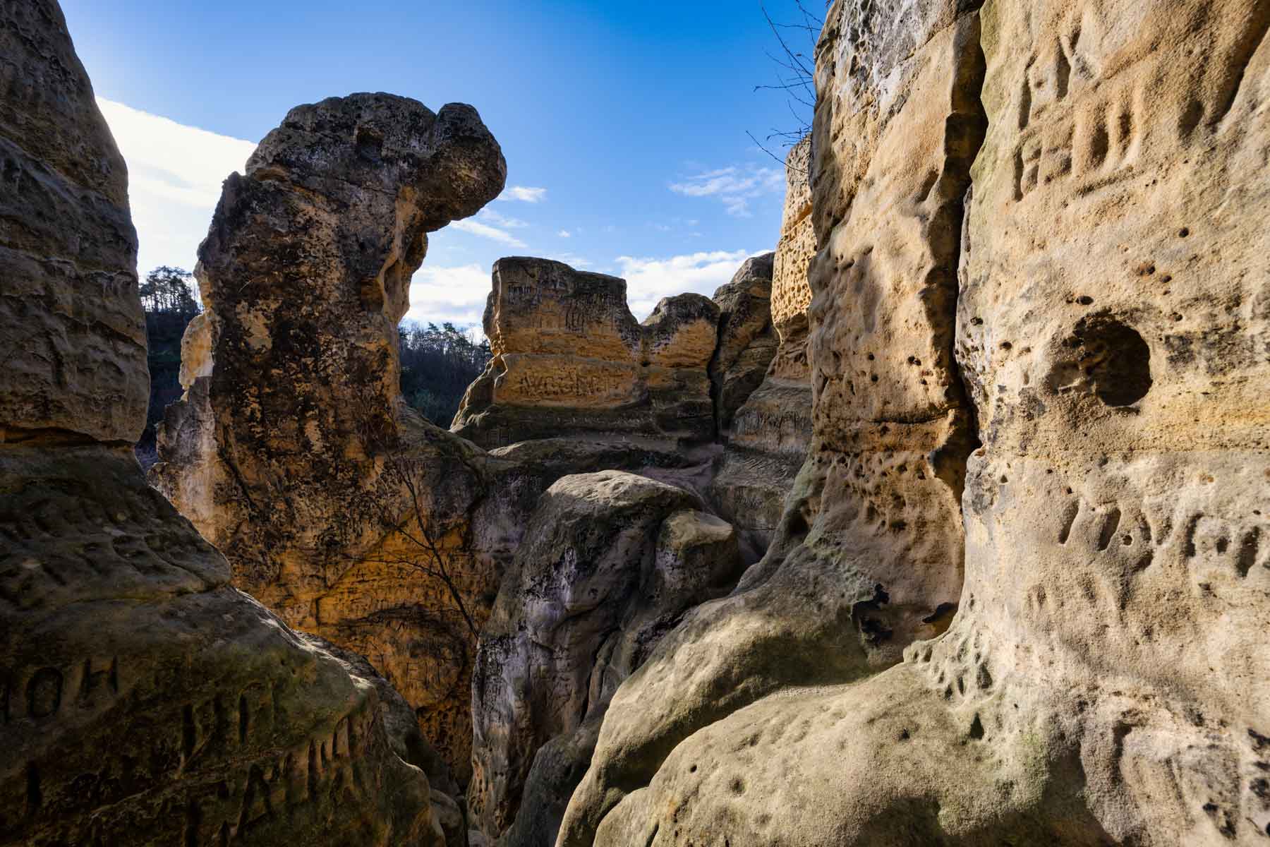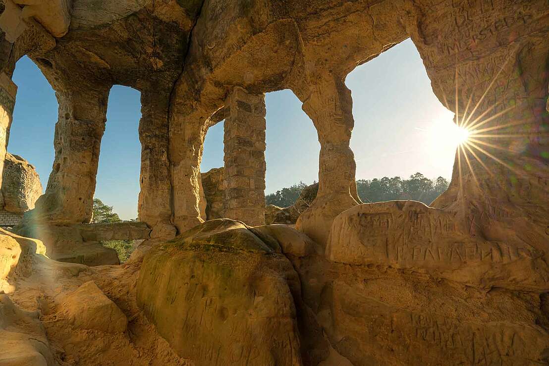 Sandstone is soft and therefore easily damaged. Weather conditions, the roots of the surrounding trees, but also vandalism have taken their toll on the rock in recent decades. To slow down the decay, Halberstadt regularly soaks the sandstone. In addition, supporting pillars have been inserted inside the cave system and some areas have been closed off with grids. During your visit, you will therefore only see some of the caves from the outside. To avoid causing additional damage, visitors are not allowed to climb the rock or take rock samples. If you wish, you can also support the conservation measures with donations.