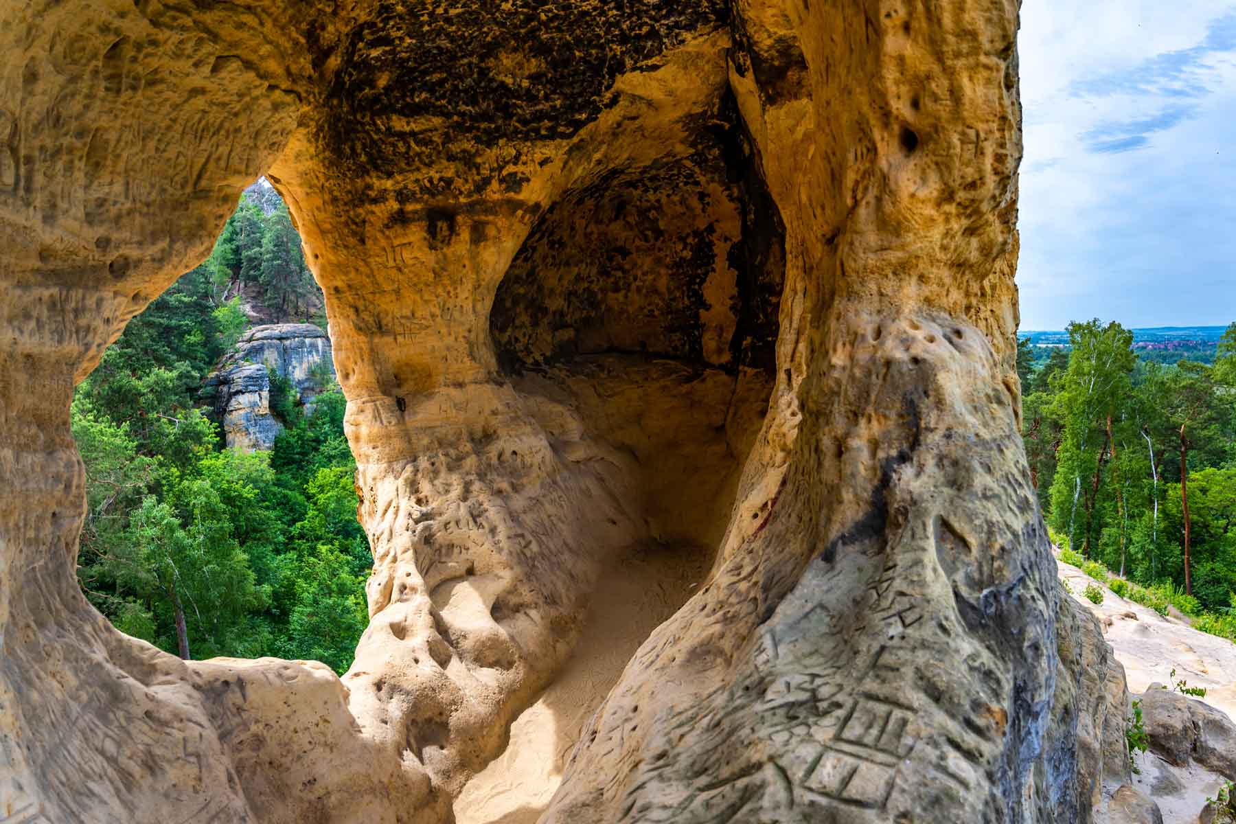 Inside the rocks, which are lined up next to each other, caves connected by passages await you. The largest is 10 metres long and 8 metres wide. It is called the upper cave or Klause. To the east of it is the so-called chapel. You can recognise it by a cross carved into the rock. Next to these two caves, there are other cavities that are smaller and resemble storage cellars.