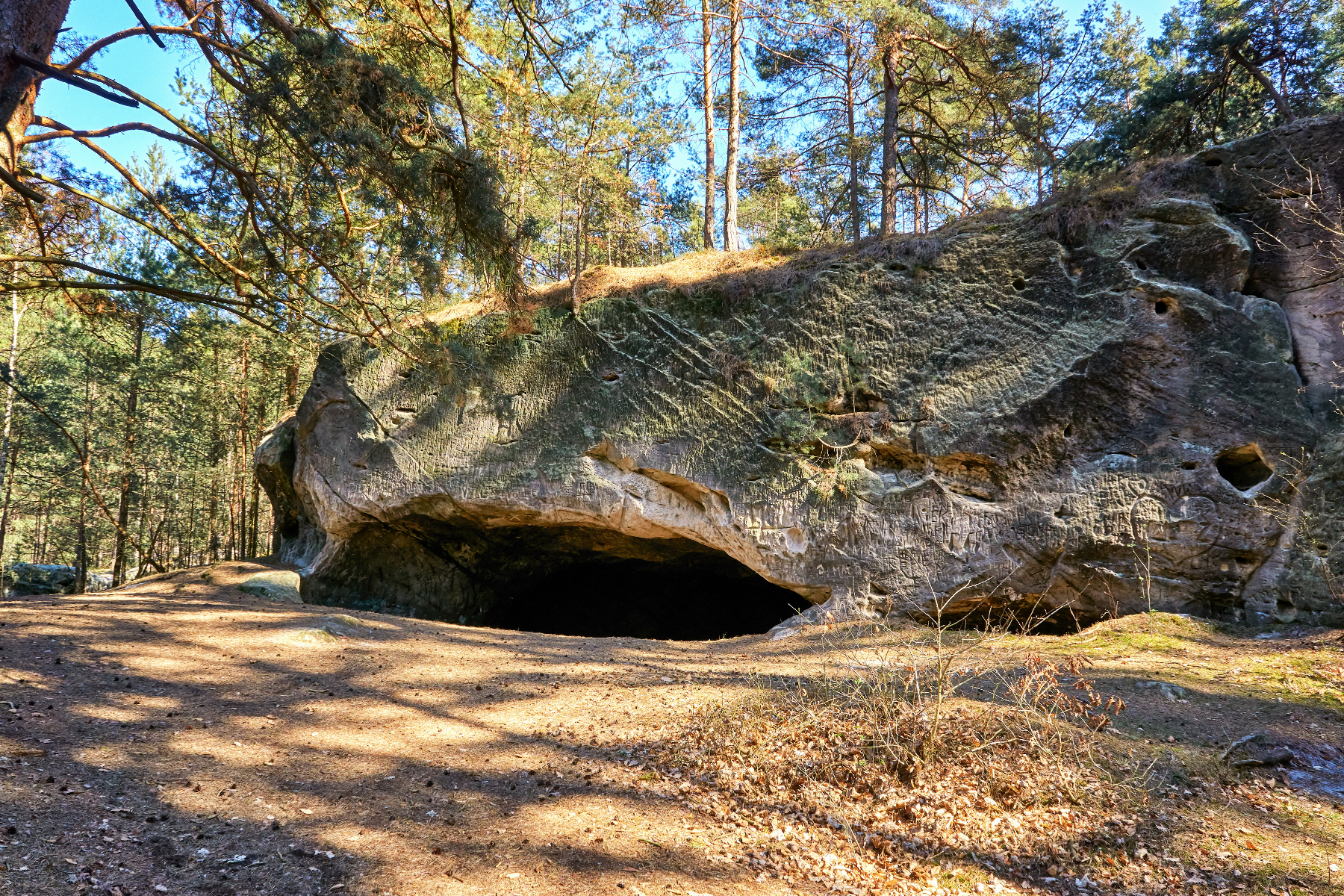 A sand-covered forest clearing, large rock caves and in the middle of it all, the Dedingstein stands alone and solitary. What was the purpose of this place in the past? It is assumed that the Germanic tribes gathered here for ritual meetings in pre-Christian times. The "Ding" or "Thing" was the name given to the Germanic tribes' judicial or popular assemblies. This could explain the name Dedingstein. During the Middle Ages, quartz sand was mined as scouring sand, known as "Stubensand". The fine sand was used for cleaning and sanding wooden floorboards and as grit.