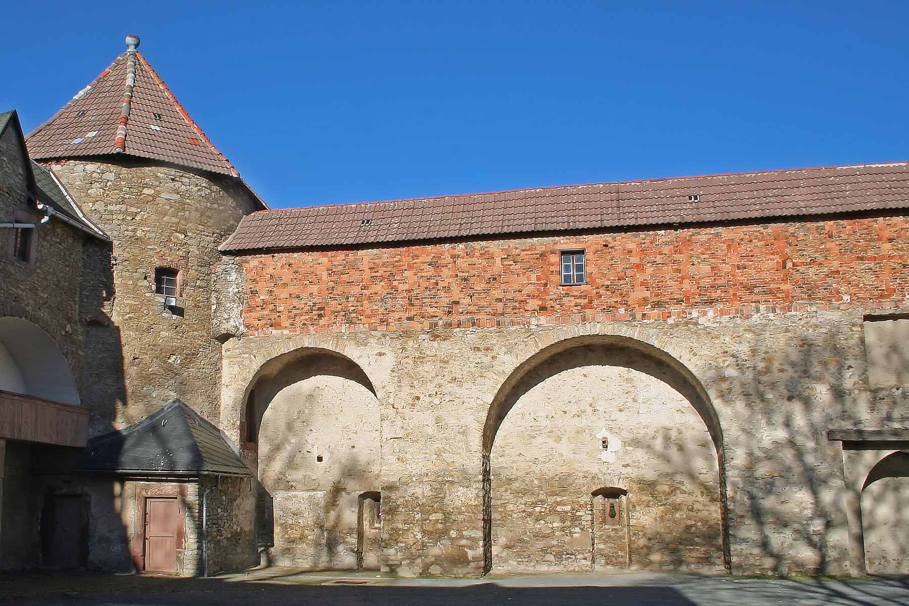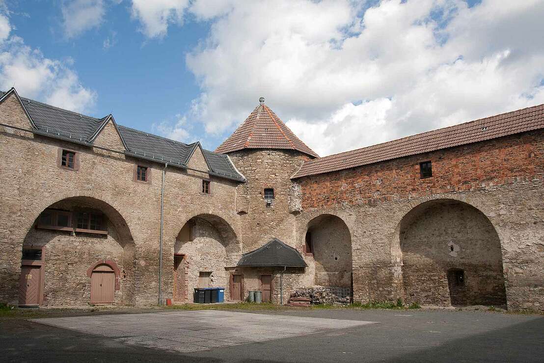 A beautiful wall painting with floral and figurative motifs from 1660 has been preserved in a window niche on the first floor. Some of the original floors and beamed ceilings have also been preserved. In the gabled room to the north, there is still a fireplace made of ashlar. Above the rectangular chimney opening we find the date 1566. On the south side there was originally another wing of the building. However, apart from a few remains of the outer wall, this was demolished in 1775. The courtyard is bordered by a wall of blind arches with covered battlements and in the north-western area there is a stone round tower.