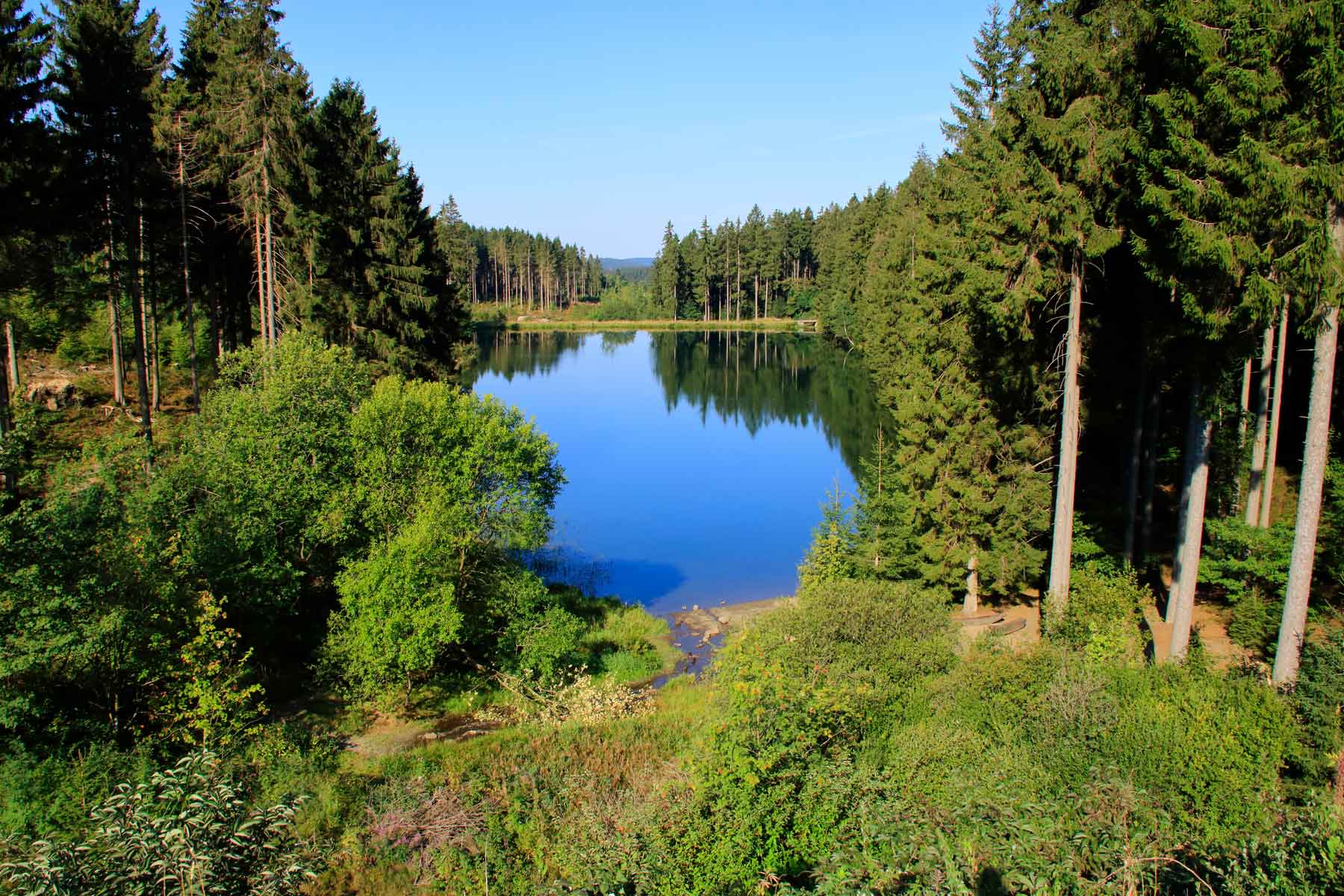 Der Grumbacher Teich bei Hahnenklee-Bockswiese ist ähnlich wie weitere Teiche um Clausthal-Zellerfeld, Hahnenklee und Wildemann künstlich angelegt worden und gehört demnach zum Harzer Wasserregal. Der Teich bietet inmitten der idyllischen Atmosphäre tolle Möglichkeiten zur Rast. Gut ausgeruht geht es schließlich weiter in Richtung Norden vorbei an der Gustav Adolf Stabkirche nahe des Liebesbankweges bis hinauf zur Granetalsperre. Die zwischen 1966 und 1969 angelegte Granetalsperre im Goslarer Bergland dient sowohl der Trinkwasserversorgung, dem Hochwasserschutz, der Wasserregulierung als auch Stromerzeugung und bietet Radfahrern an einigen Stellen einen wunderschönen Blick auf das kühle Nass.