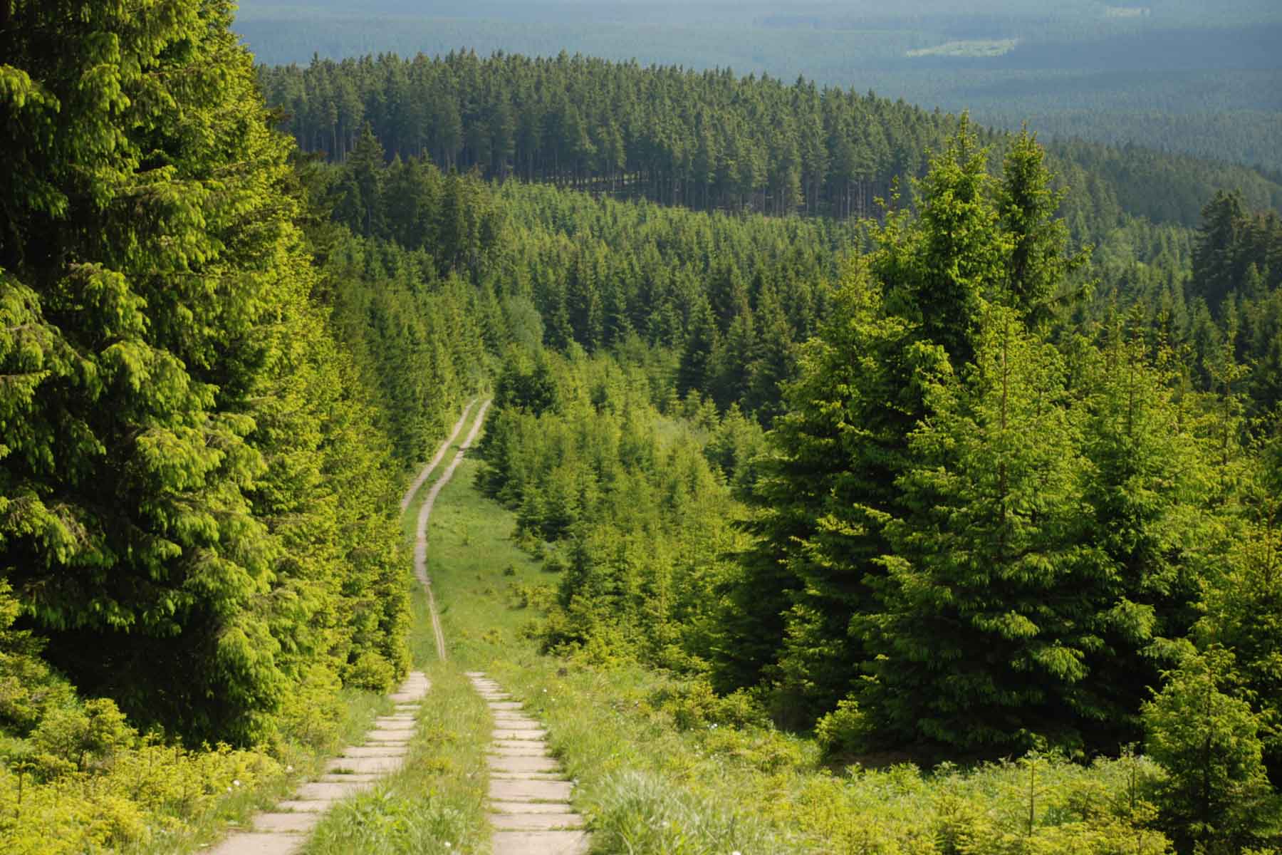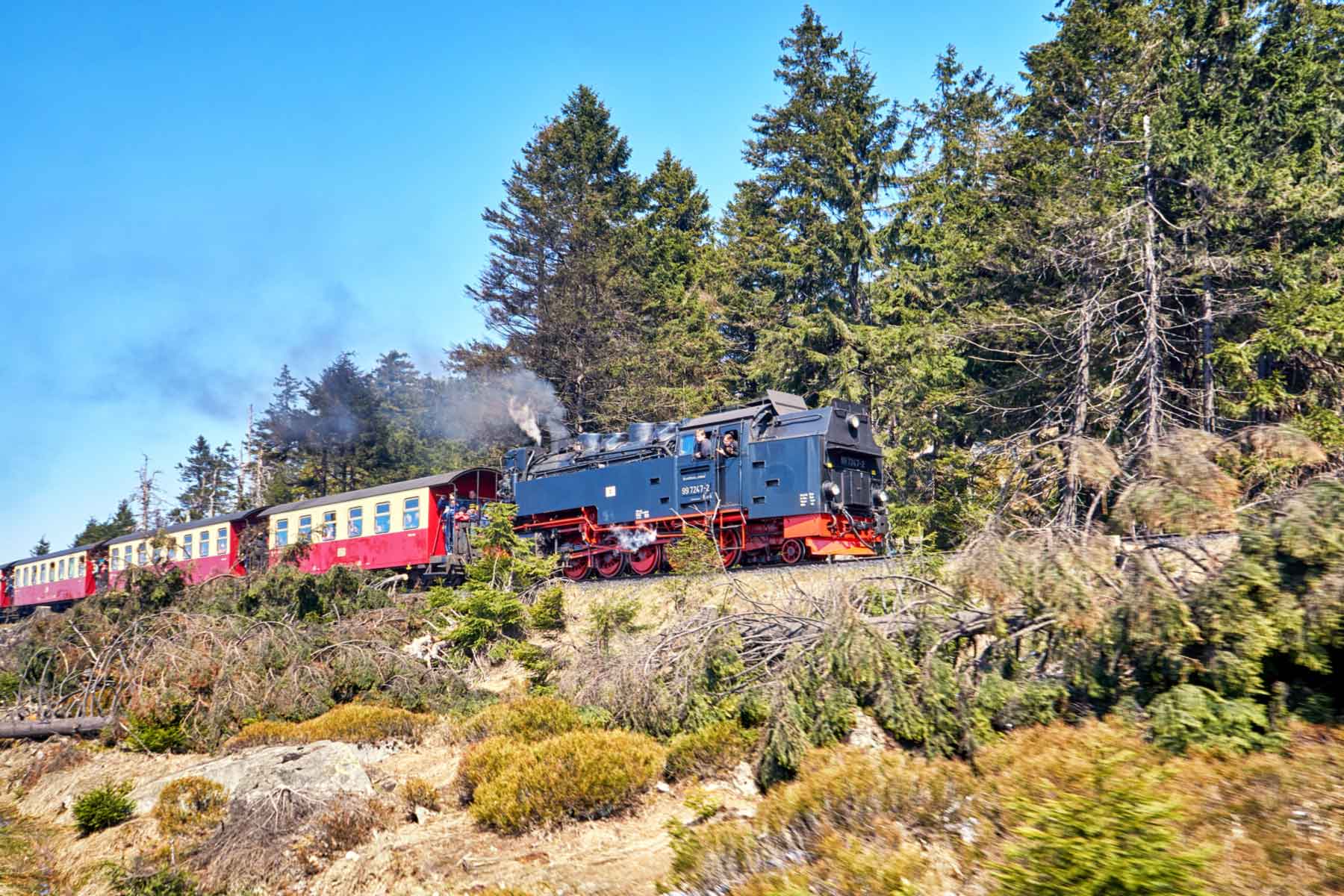 Oben angekommen lässt sich die Harzer Brockenbahn bestaunen. Die Gleise liegen an dieser stelle unmittelbar neben den Wegen, weshalb sich der Zug beim Vorbeifahren aus nächster Nähe betrachten lässt. Die Fahrt mit der Bahn ist ein Muss für jeden Harzliebhaber. Der grüne Streifen auf dem Gipfel des Brockensist der ehemalige Grenzstreifen zwischen Ost und West und bietet eine besonders ausgeprägte Artenvielfalt. Mit dem Grünen Band gelang es perfekt, das erzwungene Biotop entlang des ehemaligen Grenzstreifens zu erhalten. Neben seinem Reiz als Naturschutzgebiet mahnt es an vergangene Zeiten.
