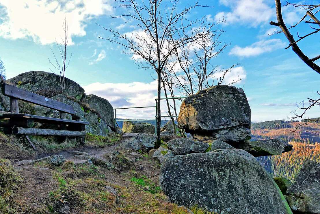 Los geht es wie Beschrieben am Bussteig der Oker Kirchenbrücke etwa 5 Kilometer in Richtung Süden. Etwas weiter hinter der Kästestraße erscheinen schließlich die gleichnamigen Kästeklippen. Kurz davor gibt es noch die Möglichkeit am Stempelkasten 118 der Harzer Wandernadel zu stempeln oder an der dazugehörigen Bank eine Pause einzulegen. Die spektakulären Klippen bilden hier an ihrer höchsten Stelle den Gipfel des Huthbergs mit 604,8 Metern Höhe, von welchem die Aussicht mit Blick in das Okertalsperre besonders bei Sonnenuntergang atemberaubend erscheint. Die Kästeklippe wird häufig auch „Alter Mann“ bezeichnet, da ihre Form an das Gesicht eines alten Mannes erinnert. Mit etwas Fantasie lassen sich Augen Nase und Mund zeichnen.