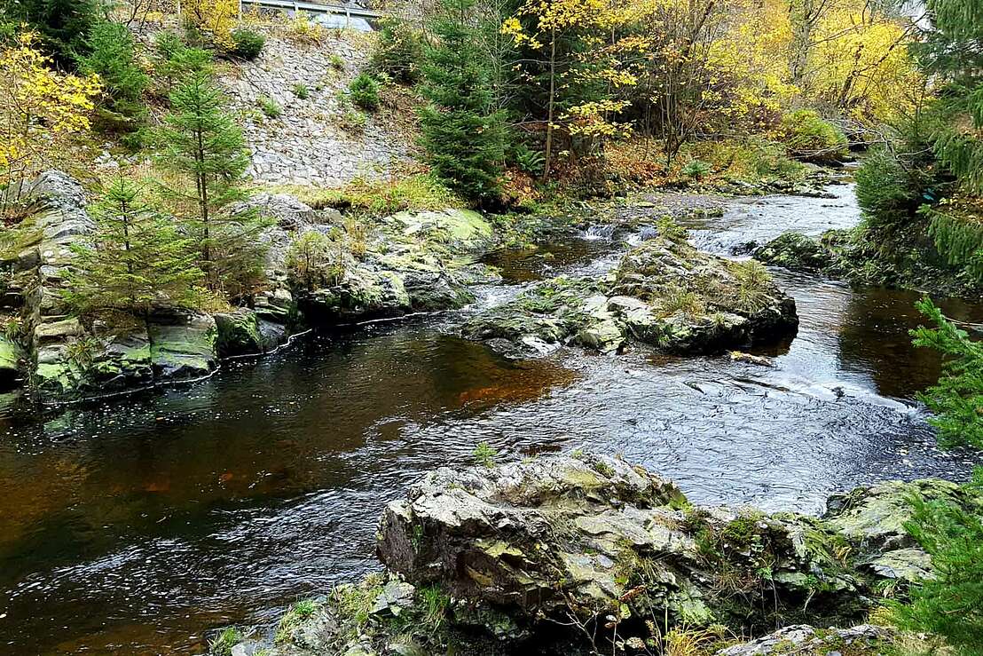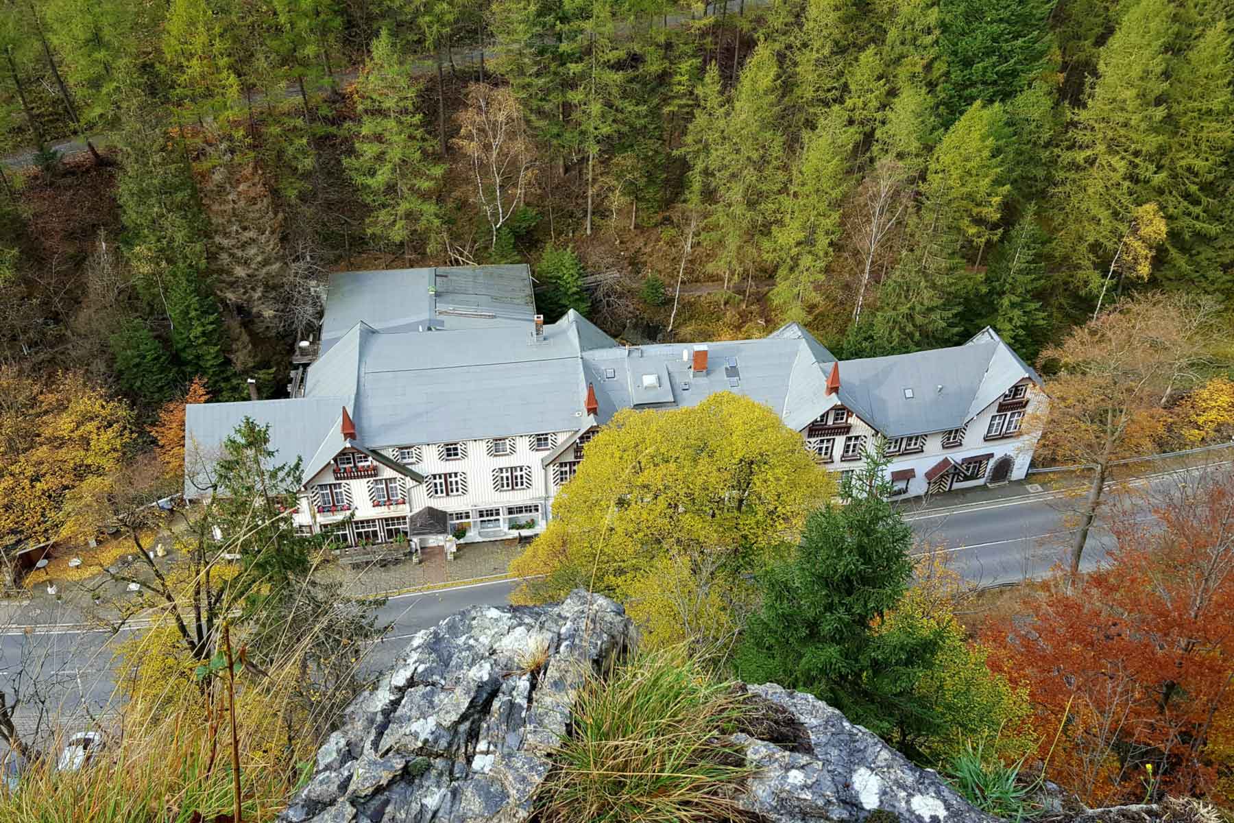Weiter geht es nach etwa 3,5 Kilometern zur nächsten „Aussicht in das Okertal“. Von der gleichnamigen Aussicht lässt sich, ähnlich wie zuvor, das Okertal sowie die Okertalsperre überblicken. Wandert man weiter entlang der Oker zur südlichsten Stelle der Wanderung, gelangt man zur Romkerhalle und dem Wasserfall. Das urige Gasthaus mit Hotel und Restaurant vermarktet sich sich als das kleinste Königreich der Weltund ist Ausgangspunkt zahlreicher weiterer Wanderungen. Der wenig entfernt gelegene Wasserfall wurde im Jahr 1863 künstlich angelegt, um die Attraktivität der Einrichtung zu steigern. Seitdem fällt der Romkerhaller Wasserfall an dieser Stelle etwa 64 Meter als Schleierkaskade in die Tiefe.