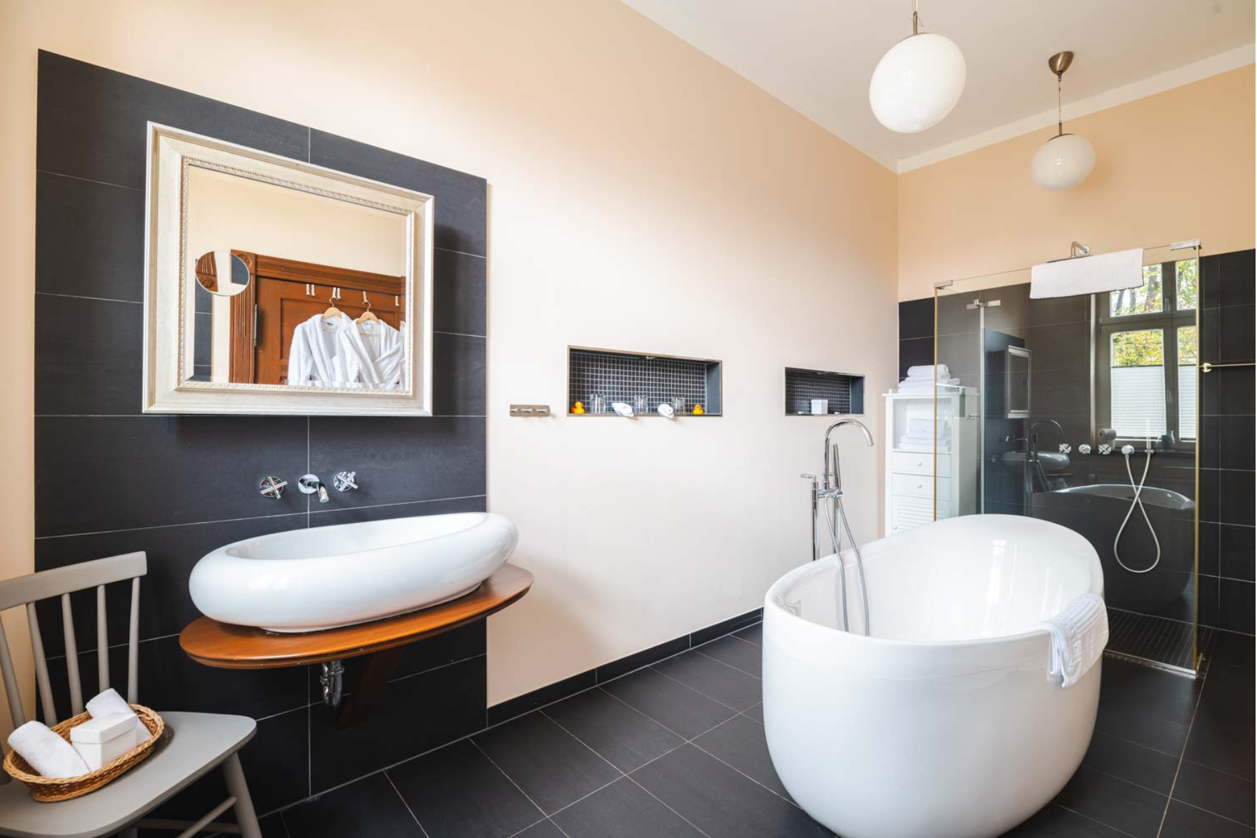 Relaks znajdziesz w oazie wellness, przestronnej łazience marzeń dla dwojga, która nie pozostawia nic do życzenia.
