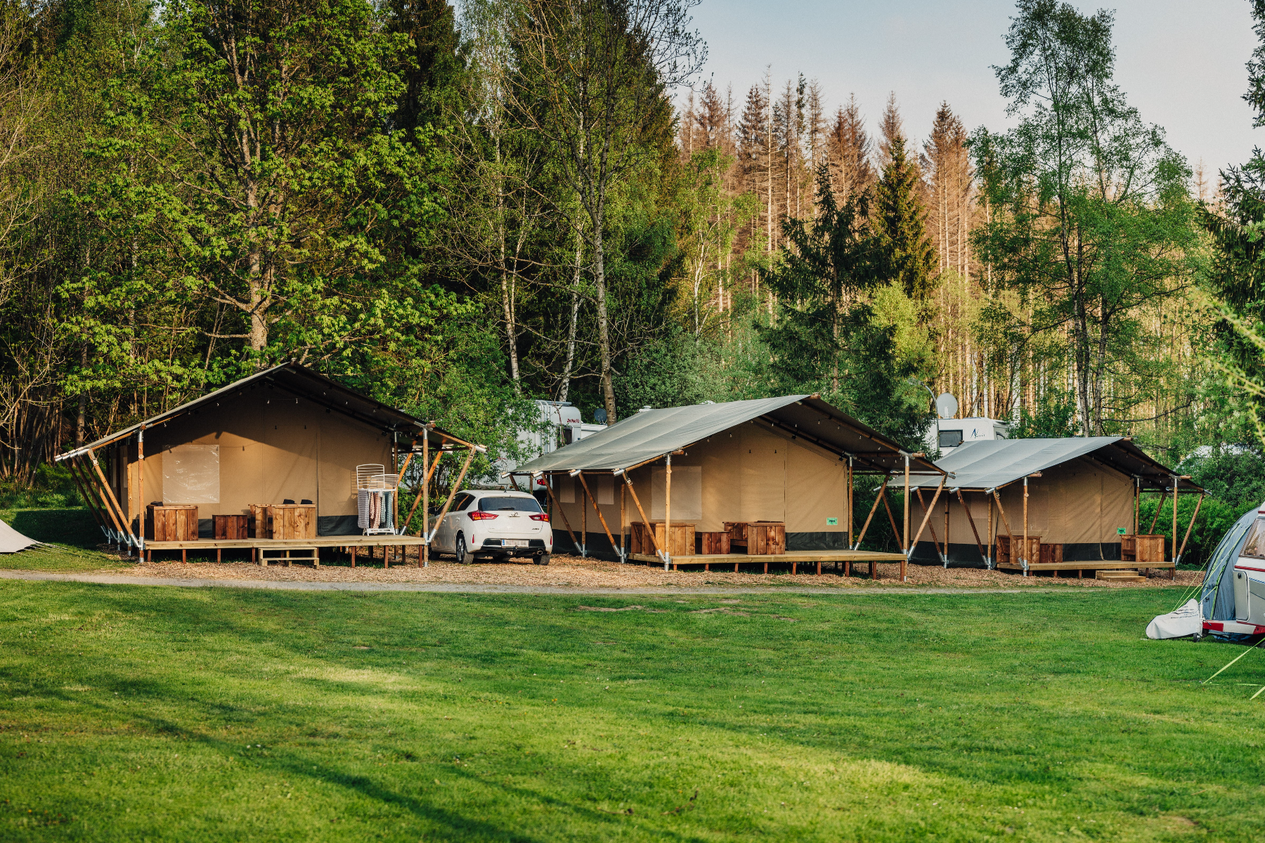 Du kannst inmitten der Natur in mehreren wunderschönen Safarizelten luxuriös campen. Die Safarizelte sind je nach Typ für 4 bis 6 Personen geeignet. Die Innenausstattung ist wunderschön und alles ist sehr gut verarbeitet. Die Zelte verfügen über einen Wohnbereich, voll ausgestatteter Küche, getrenntem Schlafzimmer mit schönen Betten, und einer Terrasse mit Blick auf die Bachwiese. Die Terrasse ist ebenfalls mit einem Lounge-Set ausgestattet. mehr Informationen
