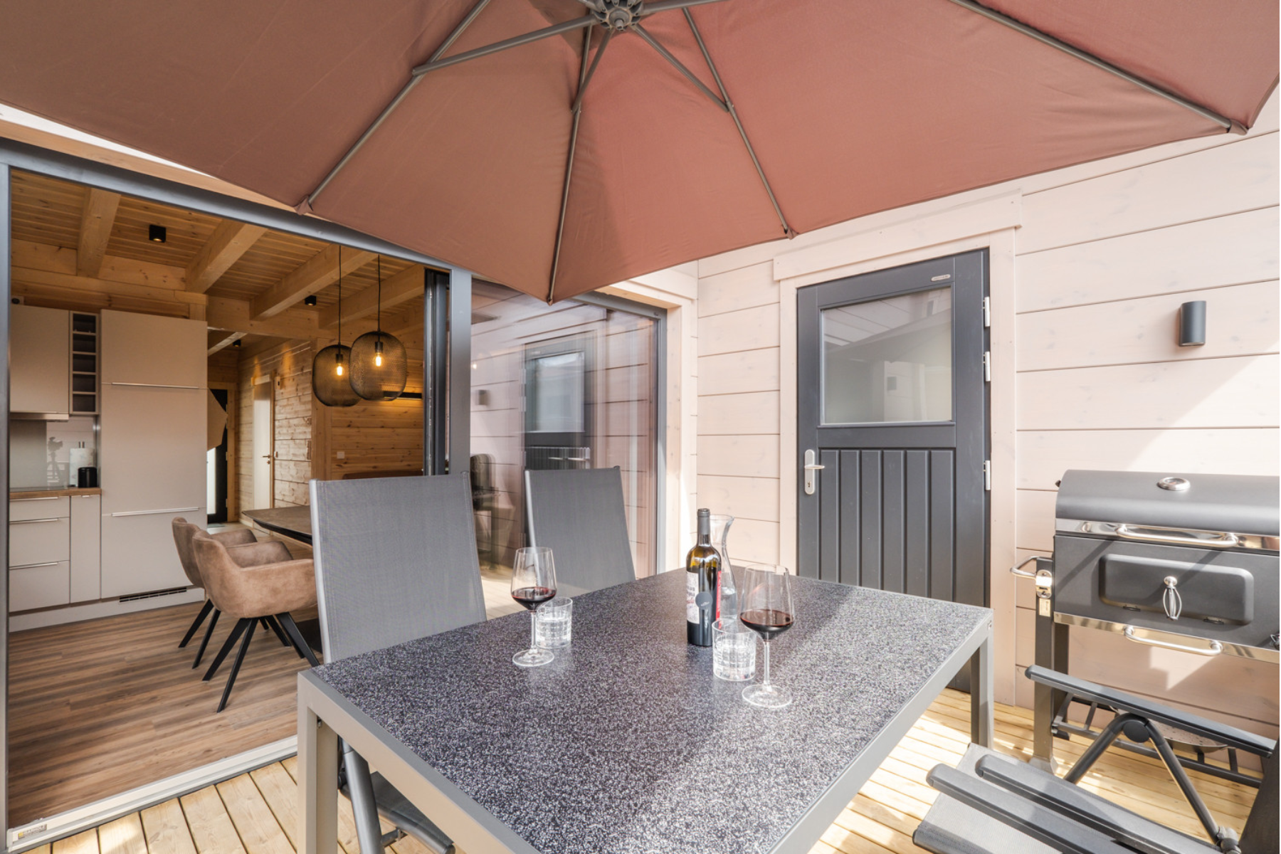 Die Terrasse ist mobliert und zusätzlich mit Grill und Ampelschirm bestückt.