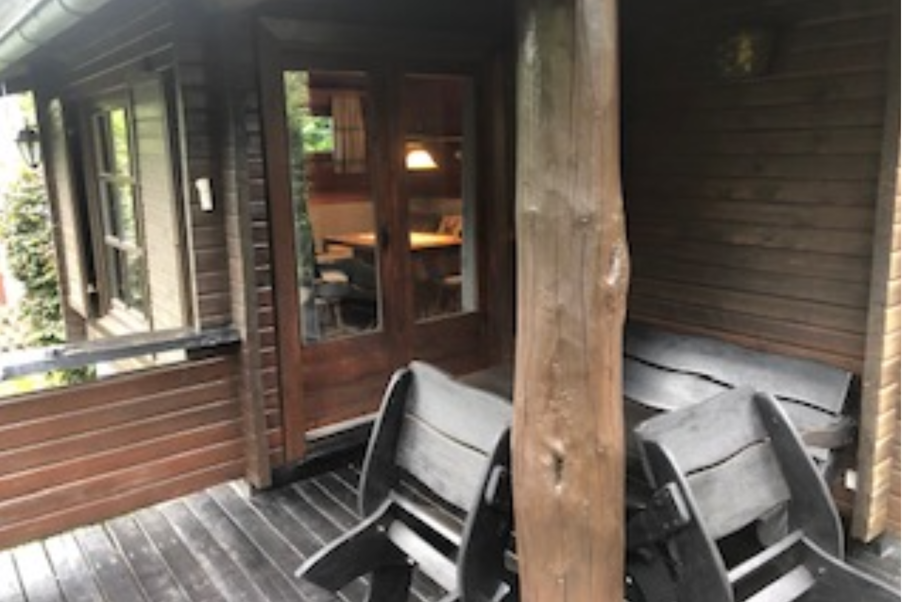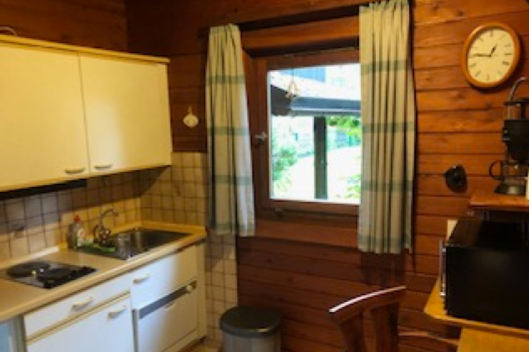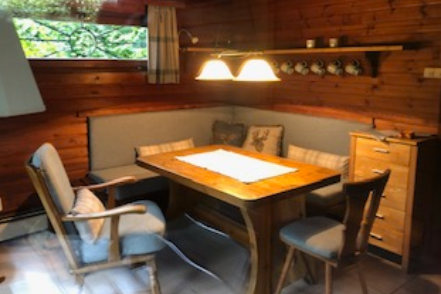 Der offen gestaltete Wohnraum ist ausgestattet mit einer bequemen Polster-Sitzecke, zwei Sesseln einem Tisch (kein Sofa!) und einem TV mit Sateliten-Empfang. Angrenzend finden Sie eine voll ausgestatteten offene Küche mit Essecke vor. Die Küchenzeile ist ausgestattet mit einem Kühlschrank, Geschirrspüler, Mikrowelle, Backofenkombi, Kaffeemaschine, Toaster und dem sonstigen Standard-Kücheninventar. Weiter finden Sie ein Badezimmer mit Dusche und WC. Zum Blockhaus gehört darüber hinaus eine wunderschöne, überdachte Terrasse mit stilechten Gartenmöbeln. Alle Räume können über eine E-Heizung individuell beheizt werden