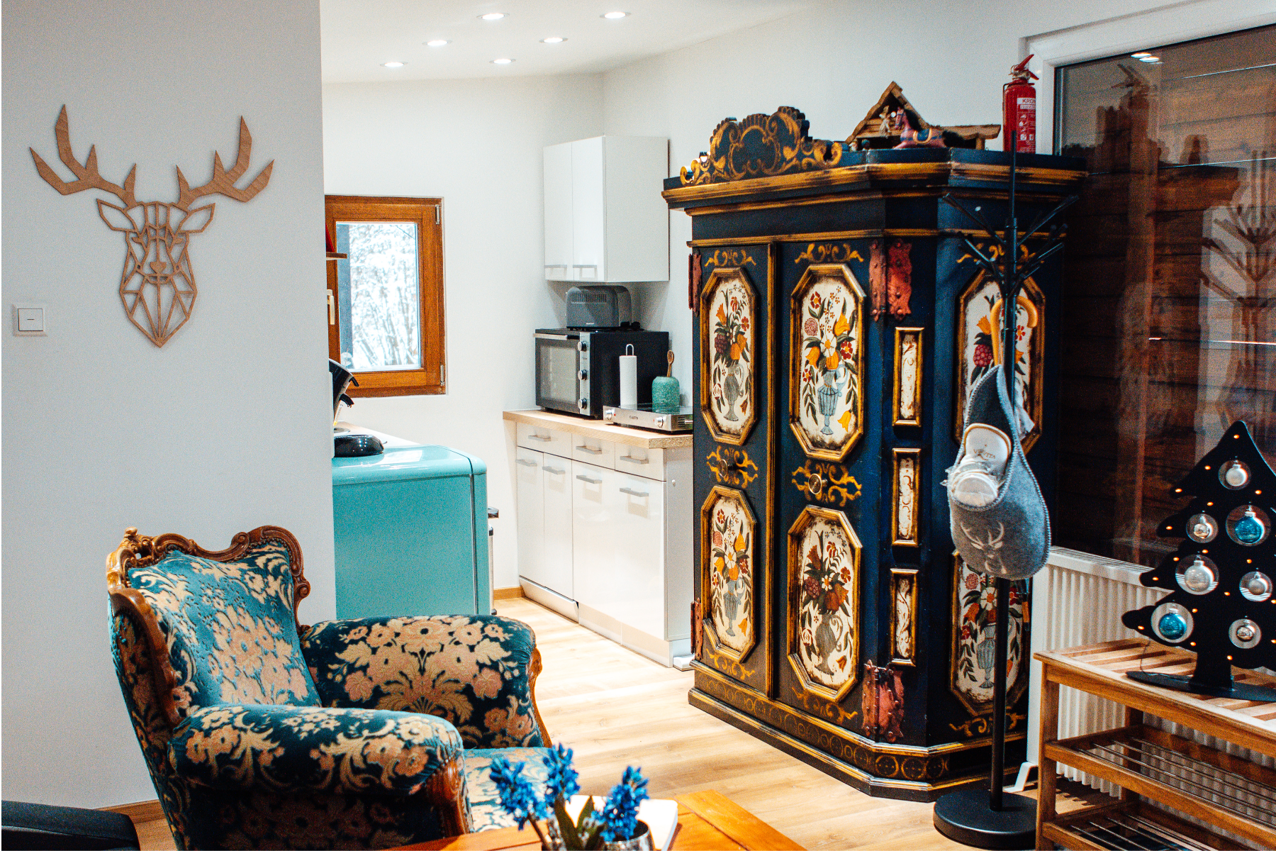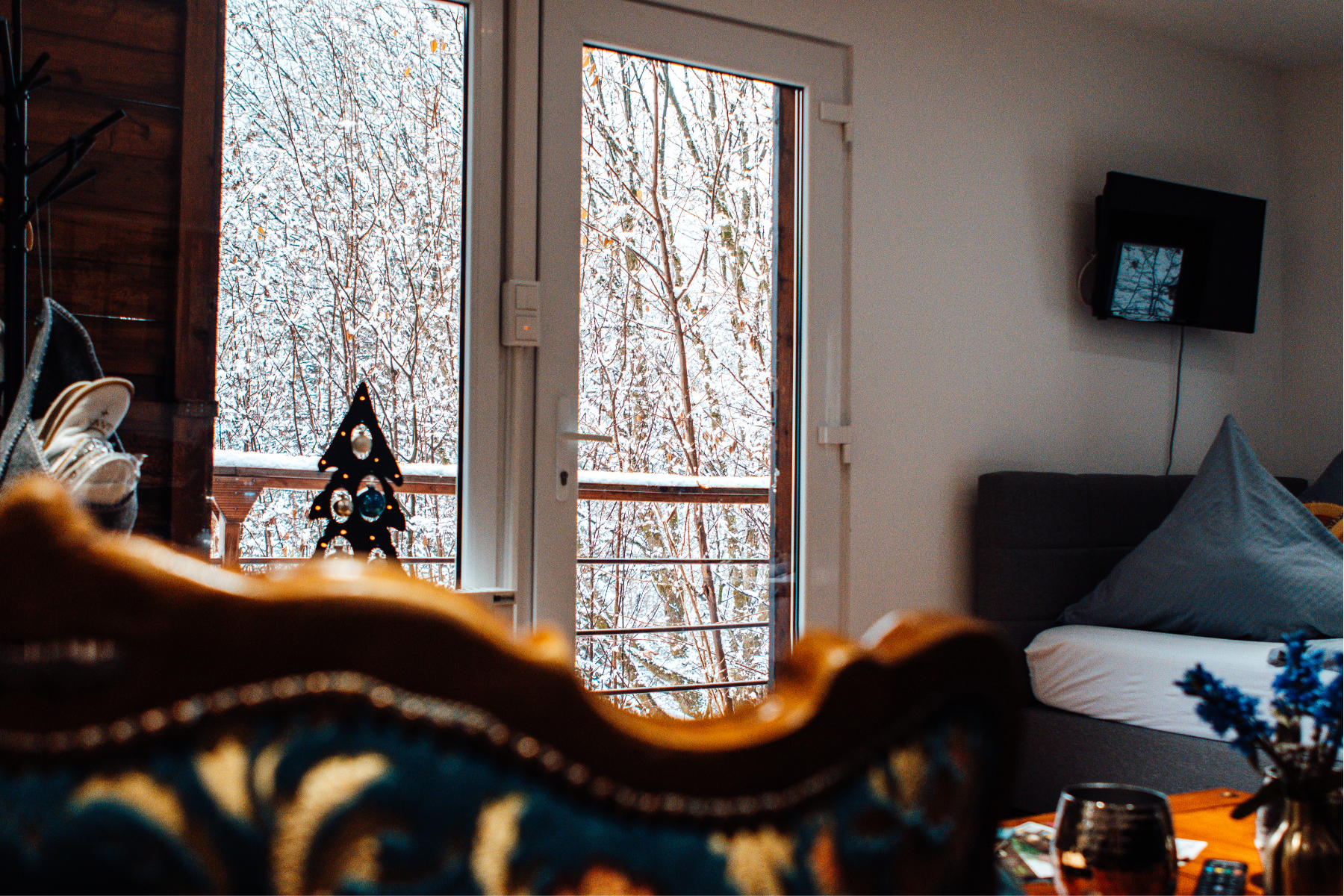 Die Einrichtung ist sehr individuell in warmen Farbtönen gehalten, der Kaminofen verbreitet nicht nur an kalten Wintertagen eine wohlige Atmosphäre. Dann noch ein verträumter Blick aus den großen Fenstern in den Wald – das ist Erholung…