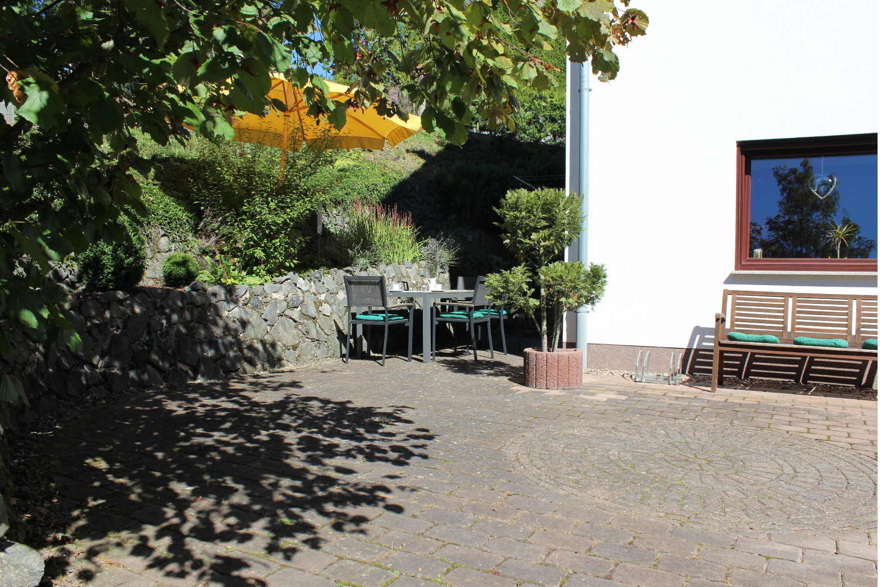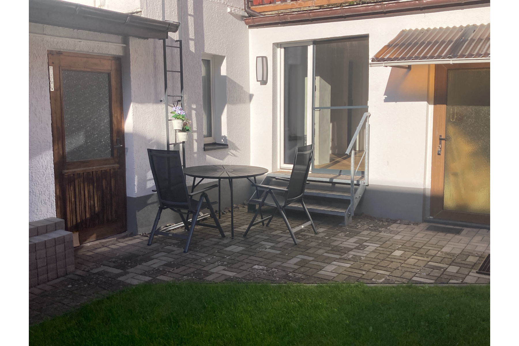 Eine eigene kleine Terrasse mit Garten-Sitzmöbeln im geschützten Innenhof lädt auch in dieser Ferienwohnung zum Ausspannen ein.