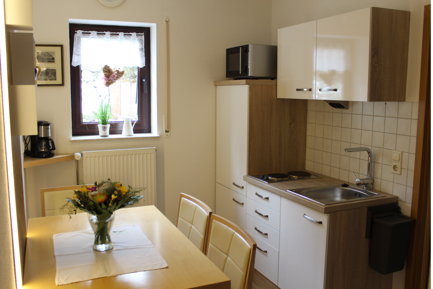 Für die Selbstverpflegung ist ein kleiner, gut ausgestatteter Küchenbereich mit Esstisch für 4 Personen vorhanden. Unseren Gästen stehen zur Nutzung Toaster, Kaffeemaschine, Wasserkocher, 2 Kochplatten, Mikrowelle und ein Kühlschrank mit Gefrierfach zur Verfügung.