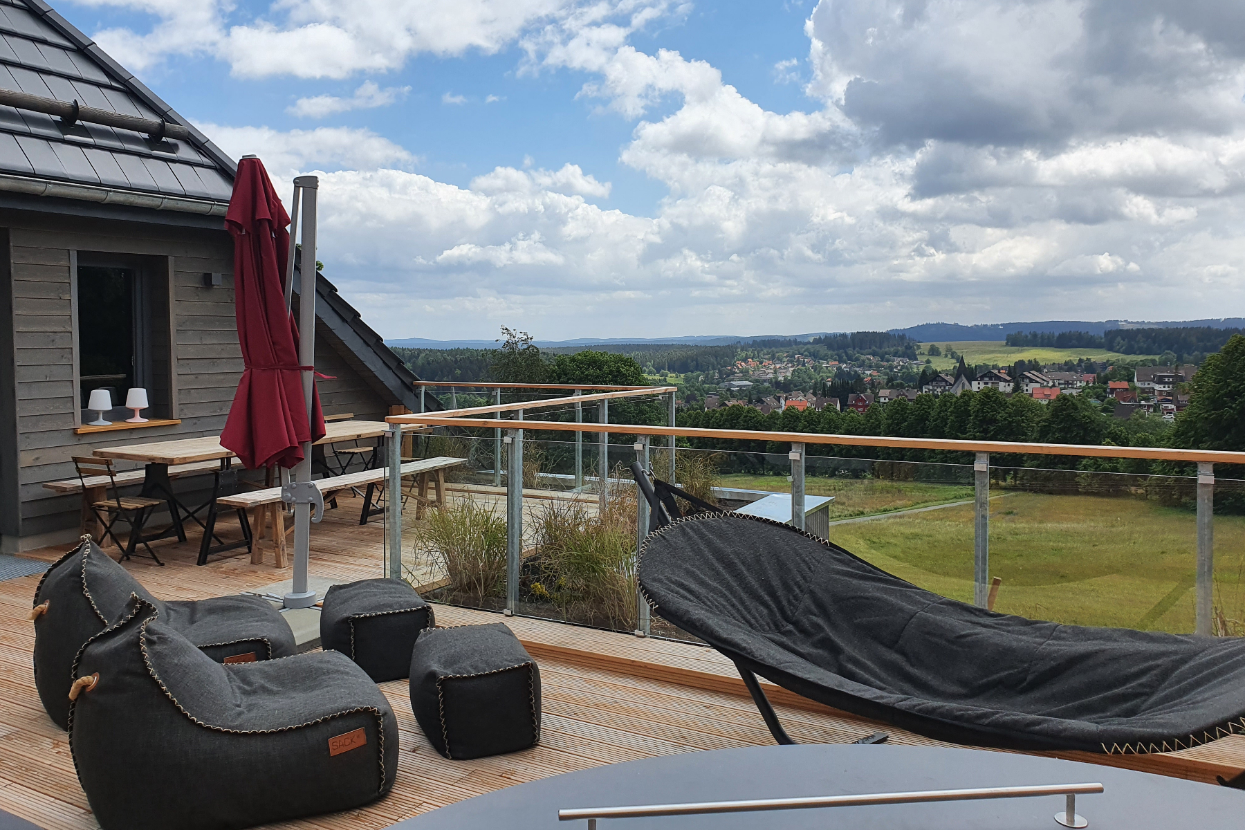 Ferner verfügt die Lodge über eine 36 qm große Terrasse mit Grill (buchbar) und Blick auf die Skiwiese und über den Harz.