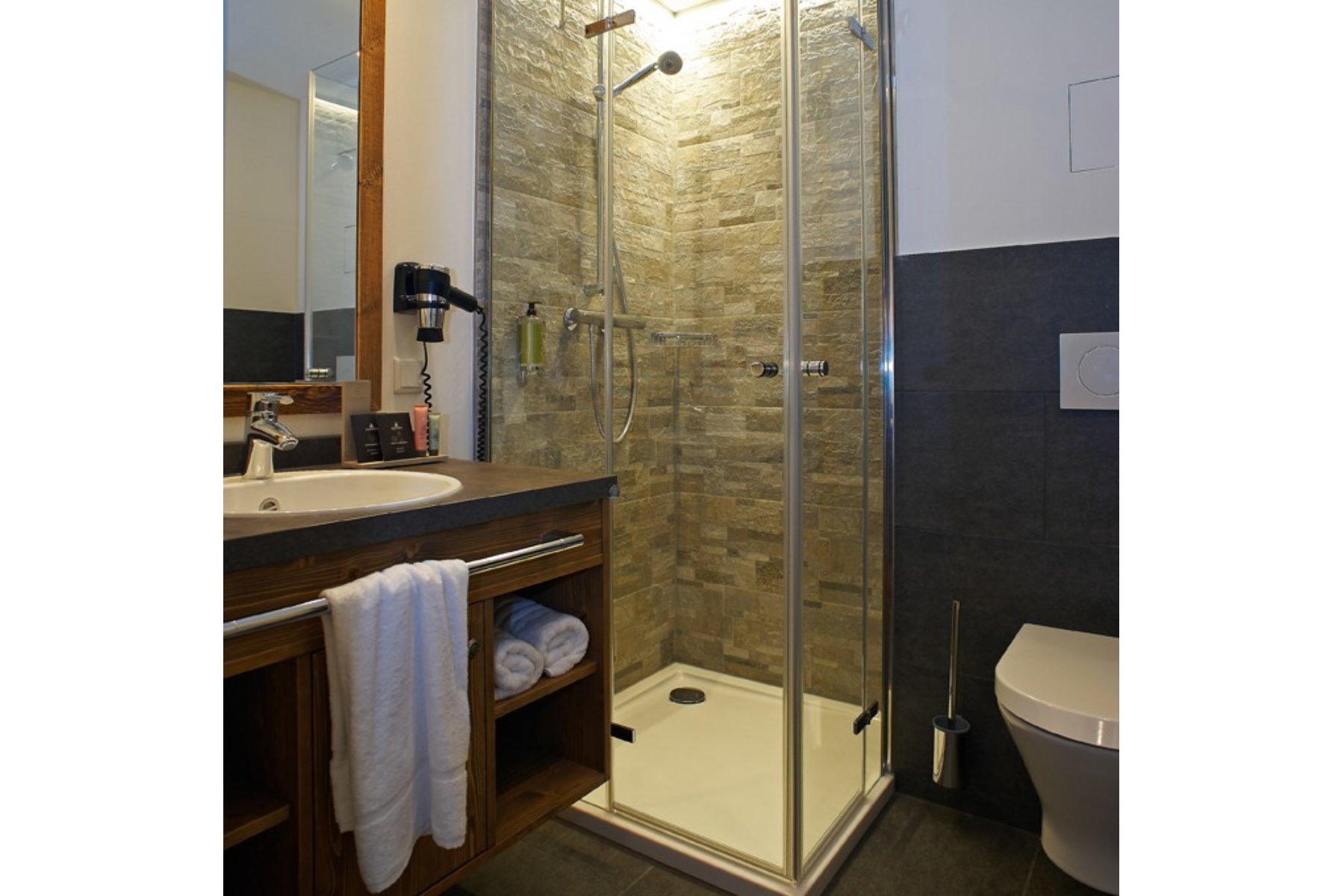 Alle Zimmer sind mit 1,80 x 2,00 m Doppelbetten ausgestattet, dazu modernen Federkernmatratzen mit Hygienebezügen, zwei Kopfkissen und Mikrofaser-Allergikerbettwäsche. Ein Babybett ist zubuchbar. In den Bädern stehen Ihnen Dusche, Schminkspiegel, Fön, Kosmetiktücher und Guest-Supplies zur Verfügung.