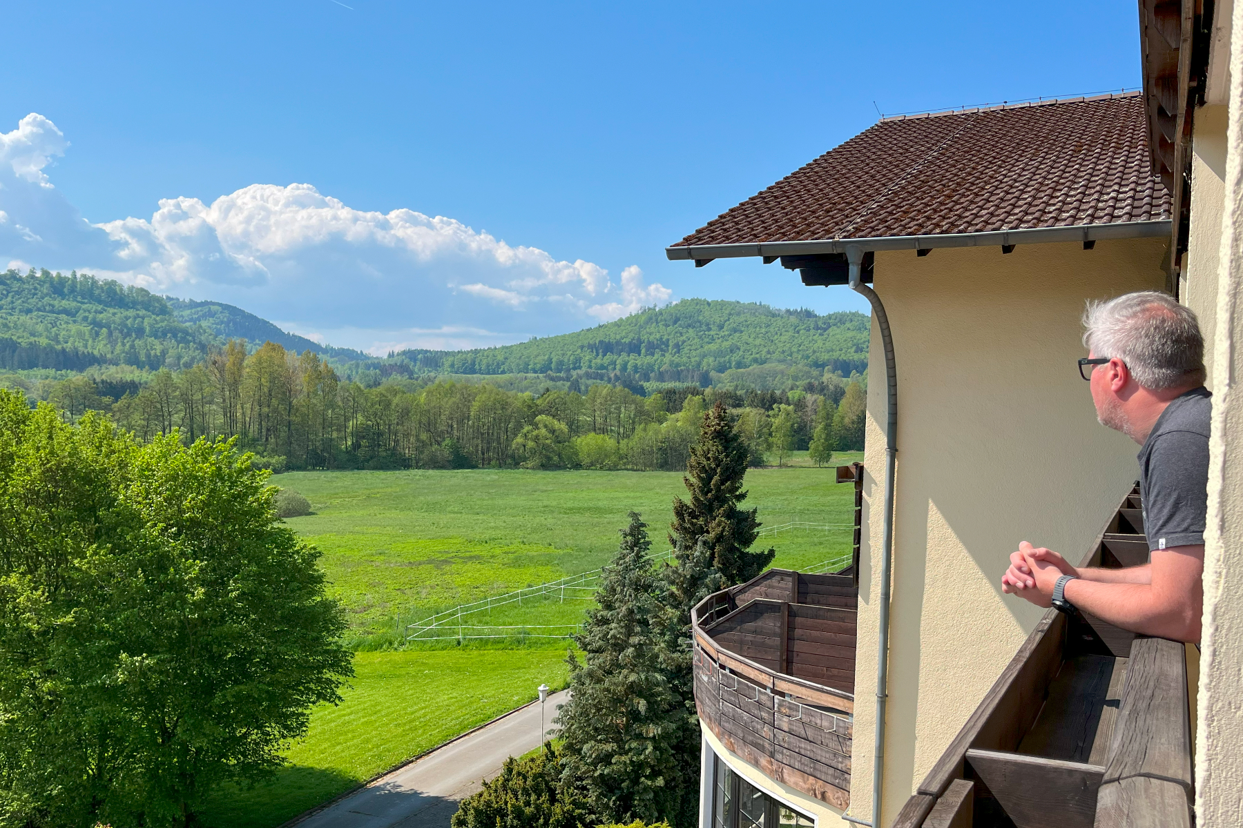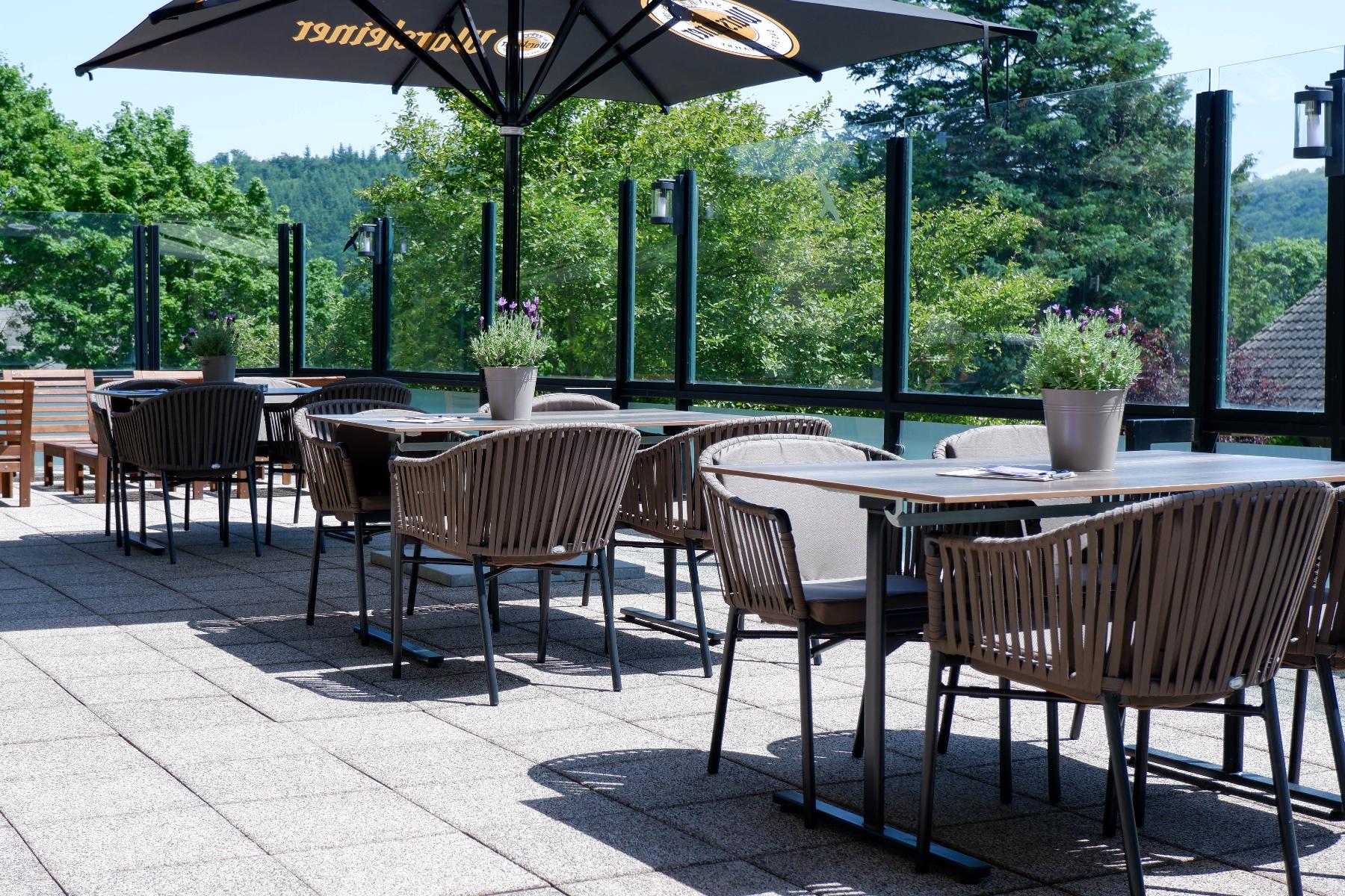 Unsere Doppelzimmer Landhaus (ca. 30 m²) befinden sich im Landhaus im Parterre und in der 1. Etage. Die Zimmer verfügen über zwei zusammenstehende Einzelbetten, ein Sidebaord, Bad mit Dusche/WC und eine großzügige Terrasse, bzw. Balkon (12 m²), welche in Richtung Wald/Wiesen, zur Straßenseite oder zum gegenüberliegenden Haupthaus, bzw. Landhaus gelegen sind. Ein zusätzlicher Sessel dienst als mögliche Aufbettung für eine 3. Person.