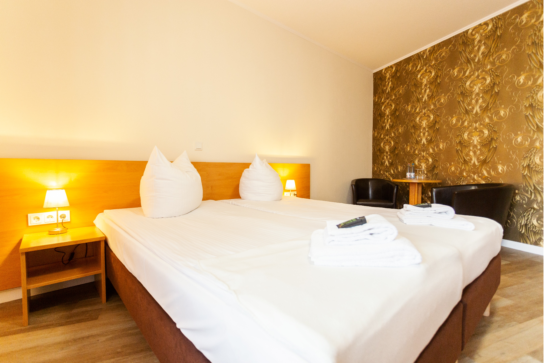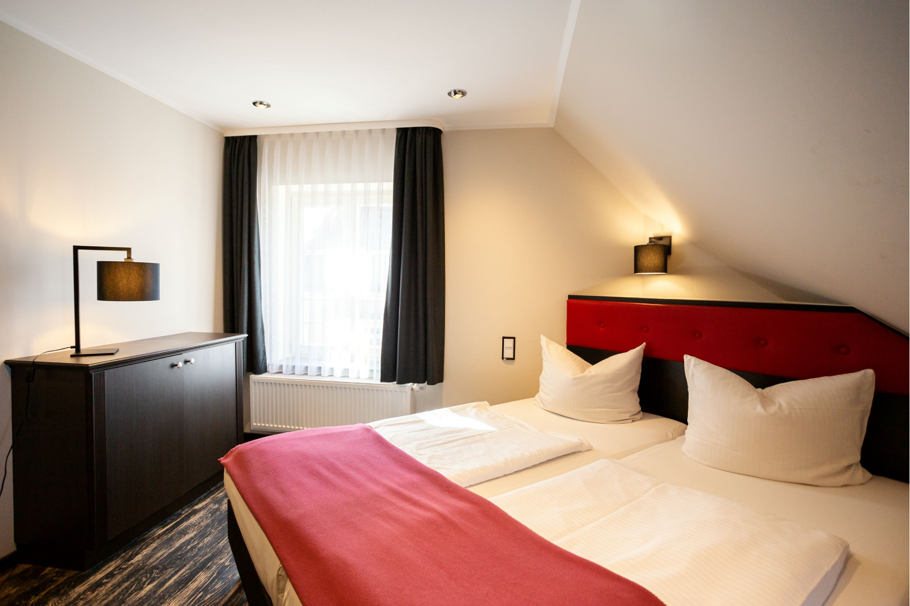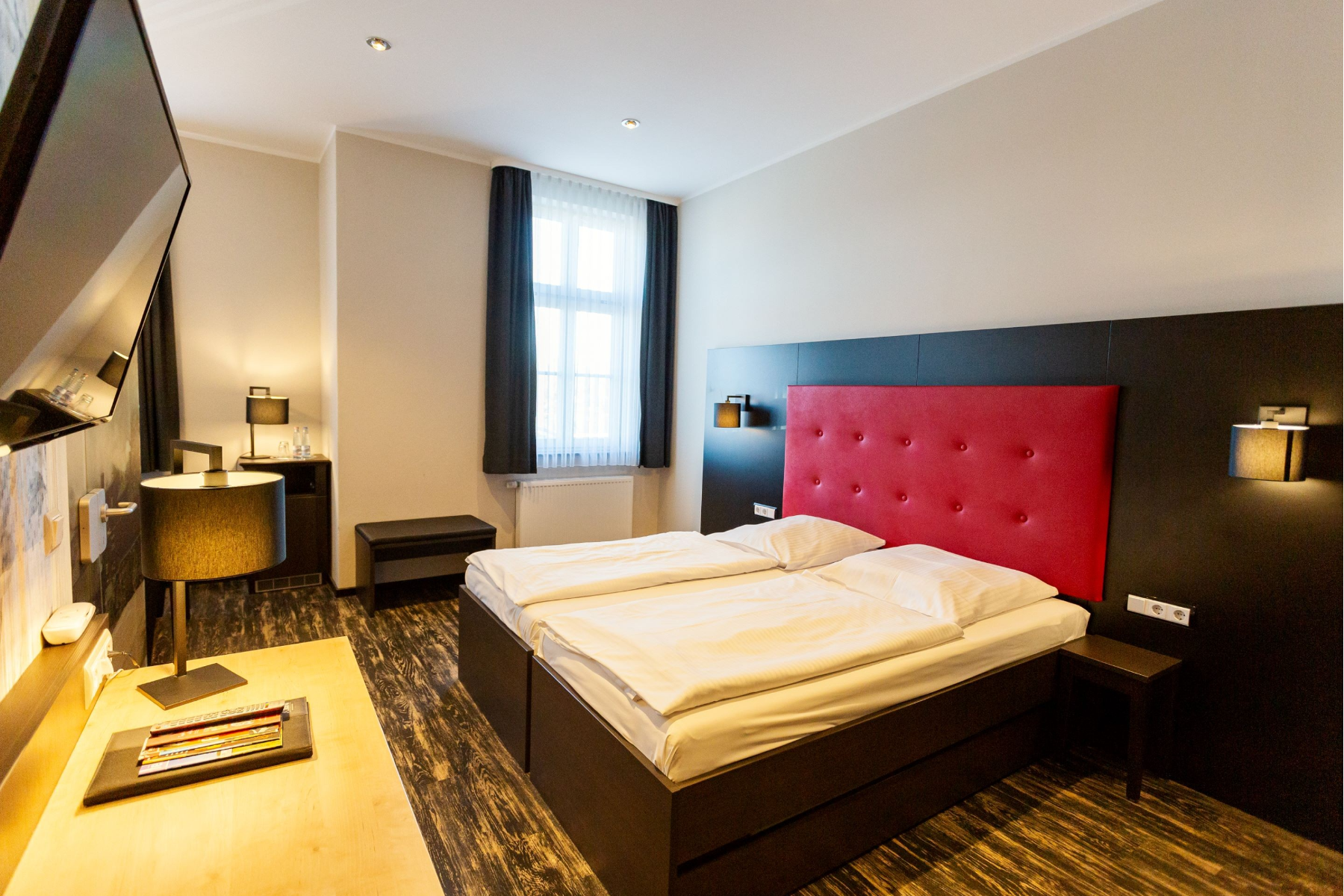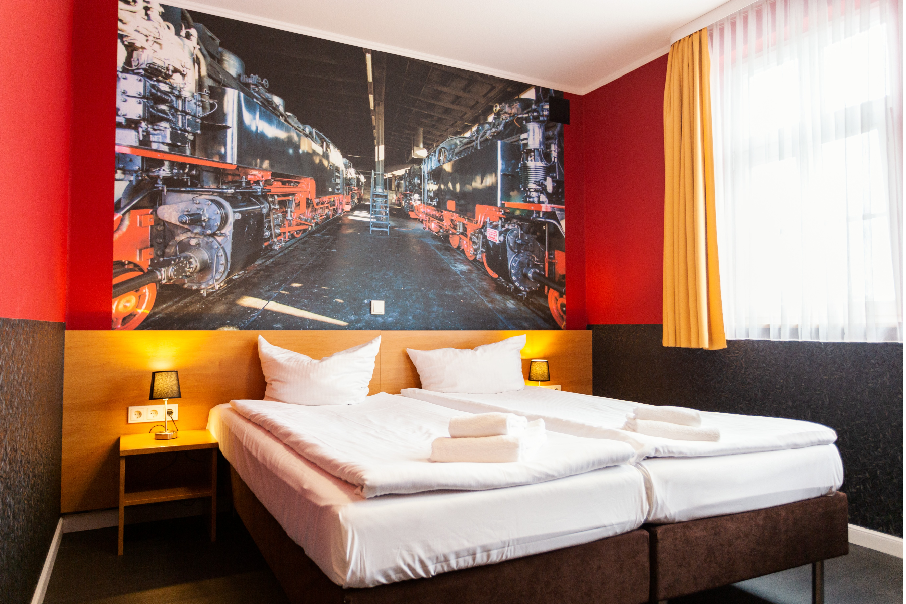Wenn es doch mal etwas gediegener Zugehen soll, können Sie es sich auf Ihrem Zimmer im gemütlichen King Size Bett bequem machen. Ein absolutes Highlight stellen hier unsere Eisenbahnzimmer mit exklusiver HSB-Fototapete, sowie unsere Deluxe Doppelzimmer und Suiten im Farbschema der schwarz-roten Loks mit zusätzlichen Eisenbahndetails dar, welche zusätzlich noch allesamt den Blick zum Bahnhof der Harzer Schmalspurbahnen bieten. Unsere weiteren Zimmerkategorien müssen sich selbstverständlich ebenfalls nicht verstecken. Im Jahr 2021 wurden alle Zimmer und Räumlichkeiten mit ausgefallenen Tapeten und hochwertigem Design-Vinylfußbodenbelag aufgewertet - ein echter Hingucker!