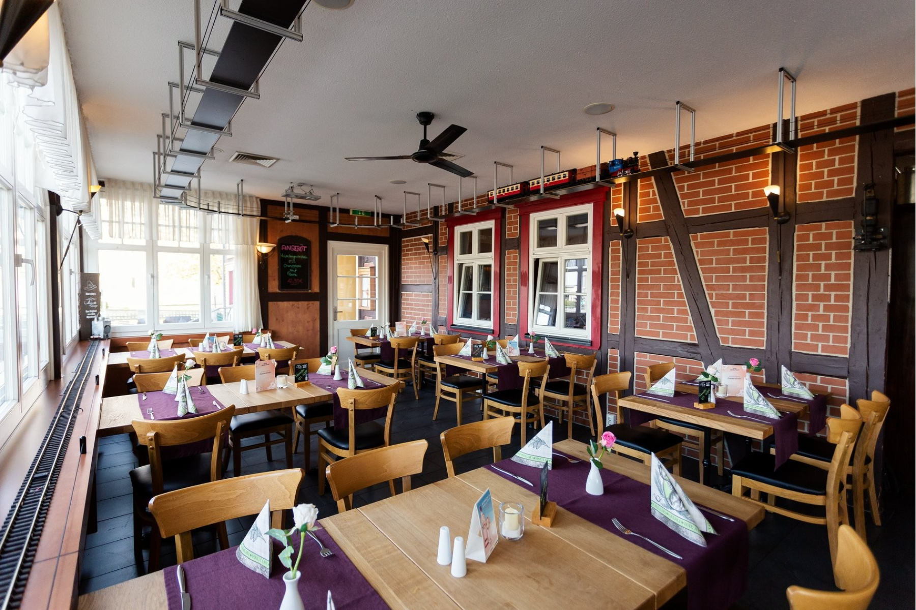 In unserem Verandarestaurant "1835" steht Ihnen unser herzliches Team von Früh bis Spät zur Seite. Ob bei der Planung Ihres Tagesausflugs, zum Start des aufregenden Tages durch ein ehrliches Frühstücksbuffet mit einer Auswahl an frischem Obst und Gemüse, Käse, warmen Eierspeisen, sowie Wurst- und Brotspezialitäten von regionalen Anbietern oder zum Abschluss des Abends mit einer Darbietung an gutbürgerlicher Küche, regionalem Bier und Weinen vom renommierten Winzer. Ein ganz besonderes Spektakel von groß gegen klein bietet hier unsere kleine Getränke-Schmalspurbahn mit Anbindung an einige unserer Tische, die Ihren großen Geschwistern schon das oder andere Mal die Show gestohlen hat.