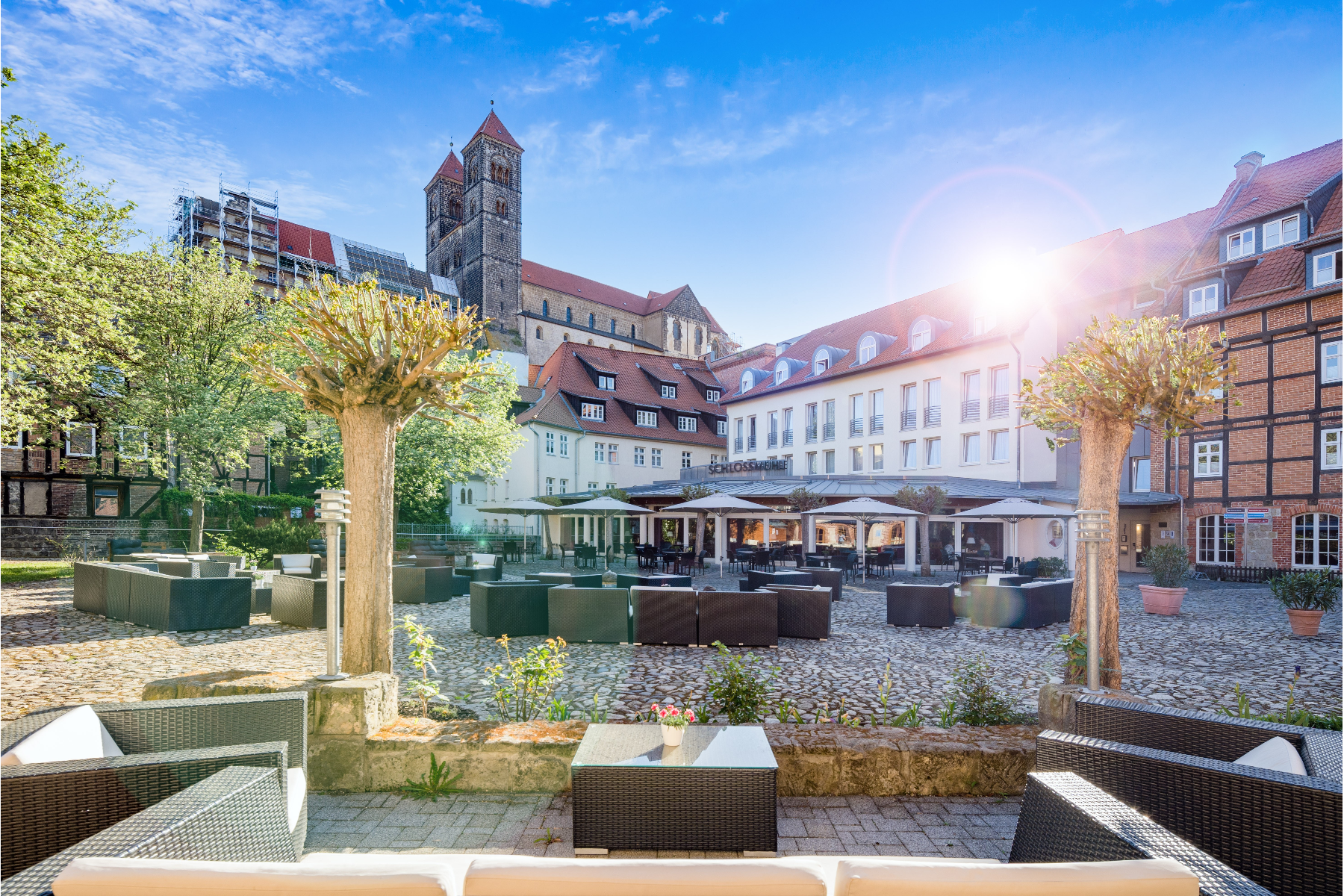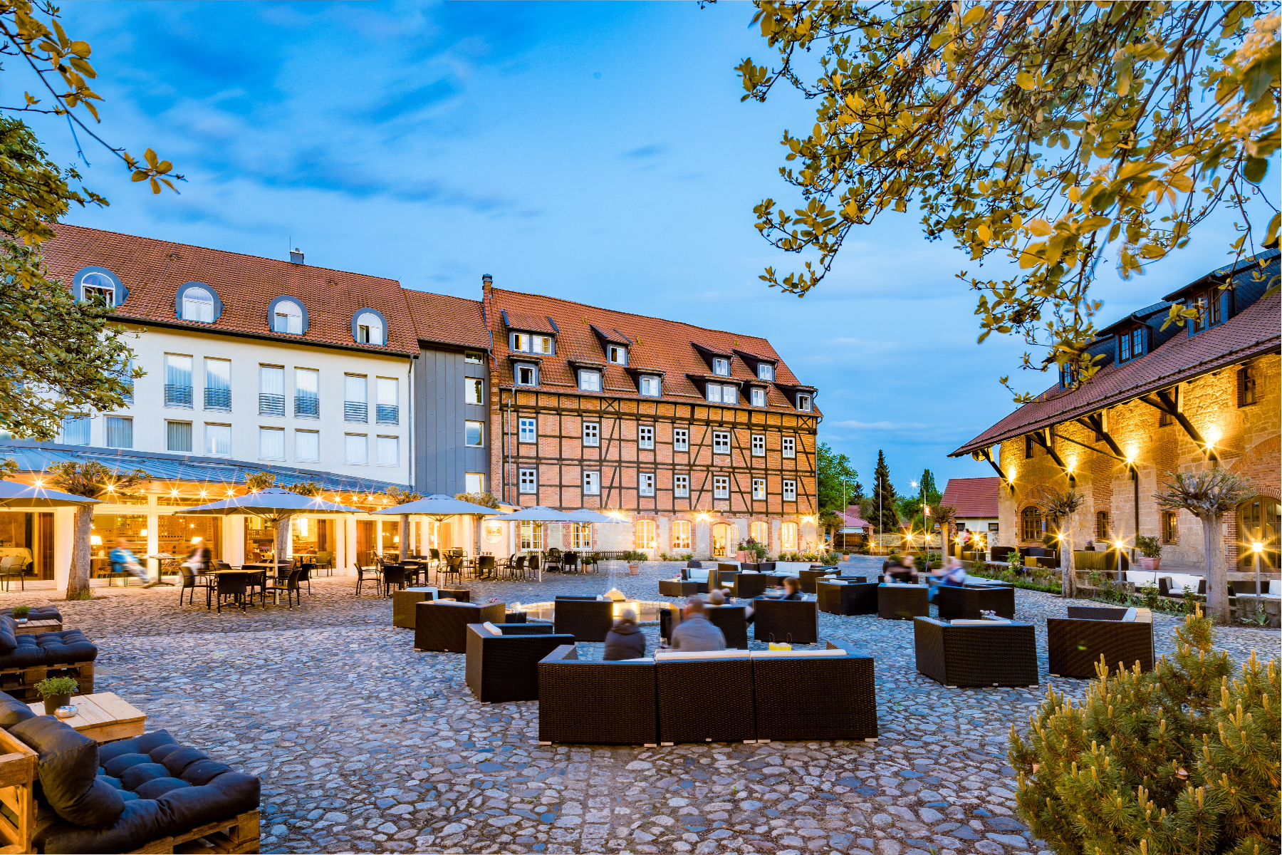 Auf dem großzügigen Areal unseres 4-Sterne-Hauses können Sie komfortabel wohnen, stilvoll feiern und rundumversorgt Atmosphäre pur genießen. Wertvolle Gebäudeteile des ehemaligen mittelalterlichen Mühlenkomplexes bestimmen heute den für unser Haus charakteristischen Charme aus historischer und neuer Architektur. Genießen Sie von unserer historischen Hofterrasse aus den freien Blick auf Schloss und Stiftskirche. Erleben Sie Gartenträume im Abteigarten und Brühlpark direkt gegenüber. Oder lassen Sie sich einfach vom Flair der historischen Fachwerkstadt berühren, die unmittelbar an das Hotelgrundstück grenzt.
