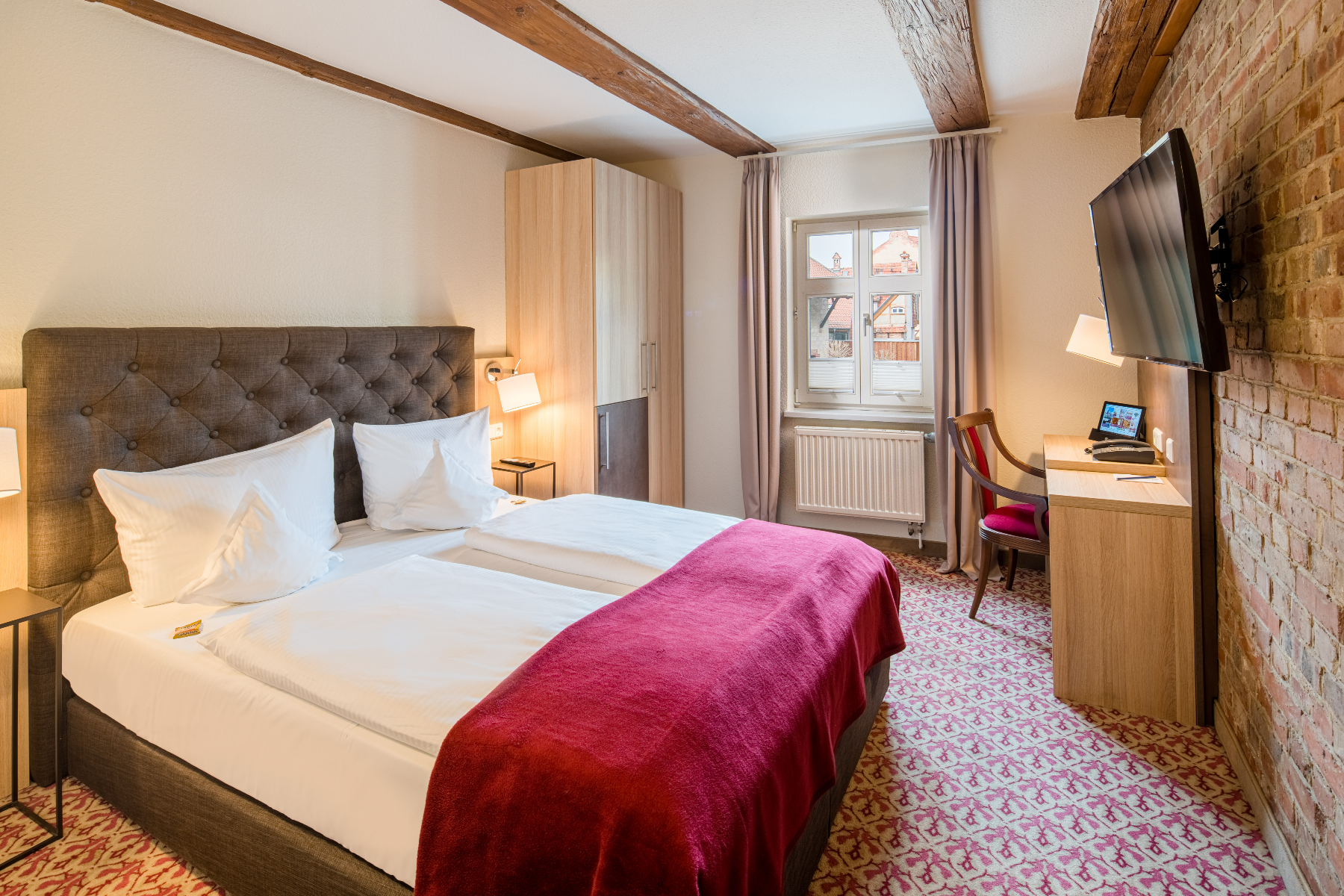 Moderne Zimmer im Neubau, Fachwerkoptik im historischen Flügel, stilvolle Einrichtung und Geräumigkeit bieten alle unsere Doppelzimmer mit klassischem Doppelbett (180 x 200), das bei Bedarf geteilt werden kann. Genießen Sie hier Ruhe und Ungestörtheit. Der Internet-Zugang ist ebenso gratis wie der Blick auf unsere hauseigene Schlossblick- Hofterrasse beziehungsweise auf Teile der historischen Altstadt.