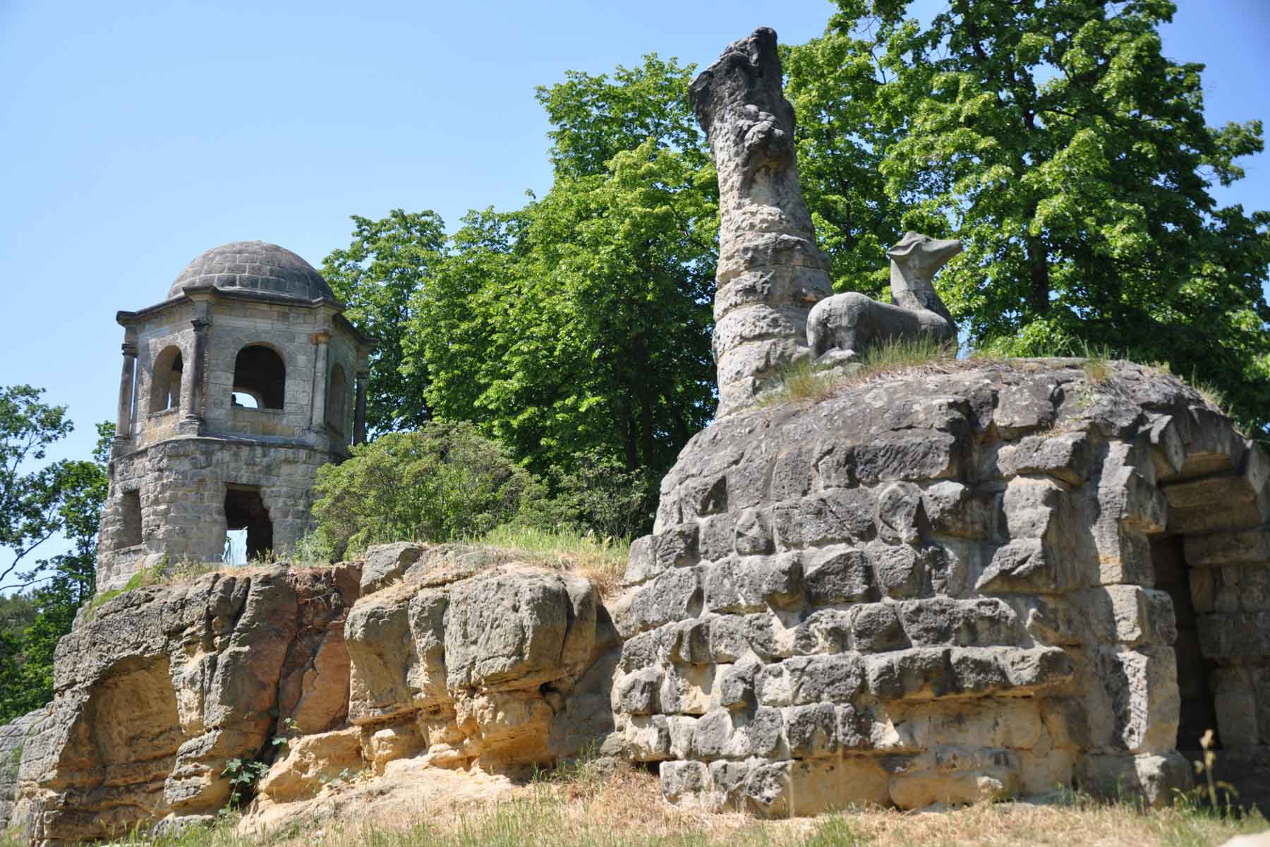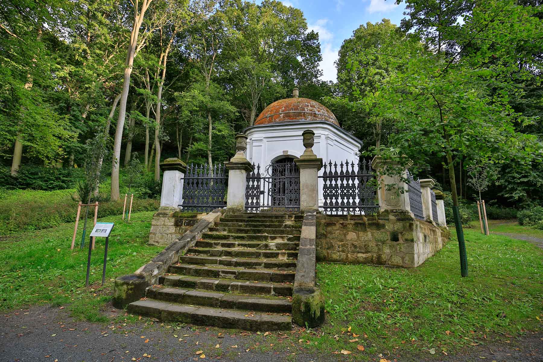 位于哈尔伯施塔特南部、历史悠久的斯皮格尔贝格景观公园被认为是德国最早的景观花园之一,由大教堂院长恩斯特-路德维希-克里斯托夫-斯皮格尔-祖姆-迪森贝格(Ernst Ludwig Christoph Spiegel zum Diesenberg)于 1761 年左右创建。他与诗人约翰-威廉-路德维希-格莱姆(Johann Wilhelm Ludwig Gleim)周围的文化圈关系密切,被认为是一位特别开明的人,这一点也反映在园内的建筑和典故中。冯-施皮格尔男爵经常被描述为自由精神,他于 1771 年向公众开放了这座英式公园,供自己愉悦和享受。他在设计这座公园时受到了德绍附近的沃利茨公园的启发,现在这座公园已成为萨克森-安哈尔特花园梦网络的一部分。