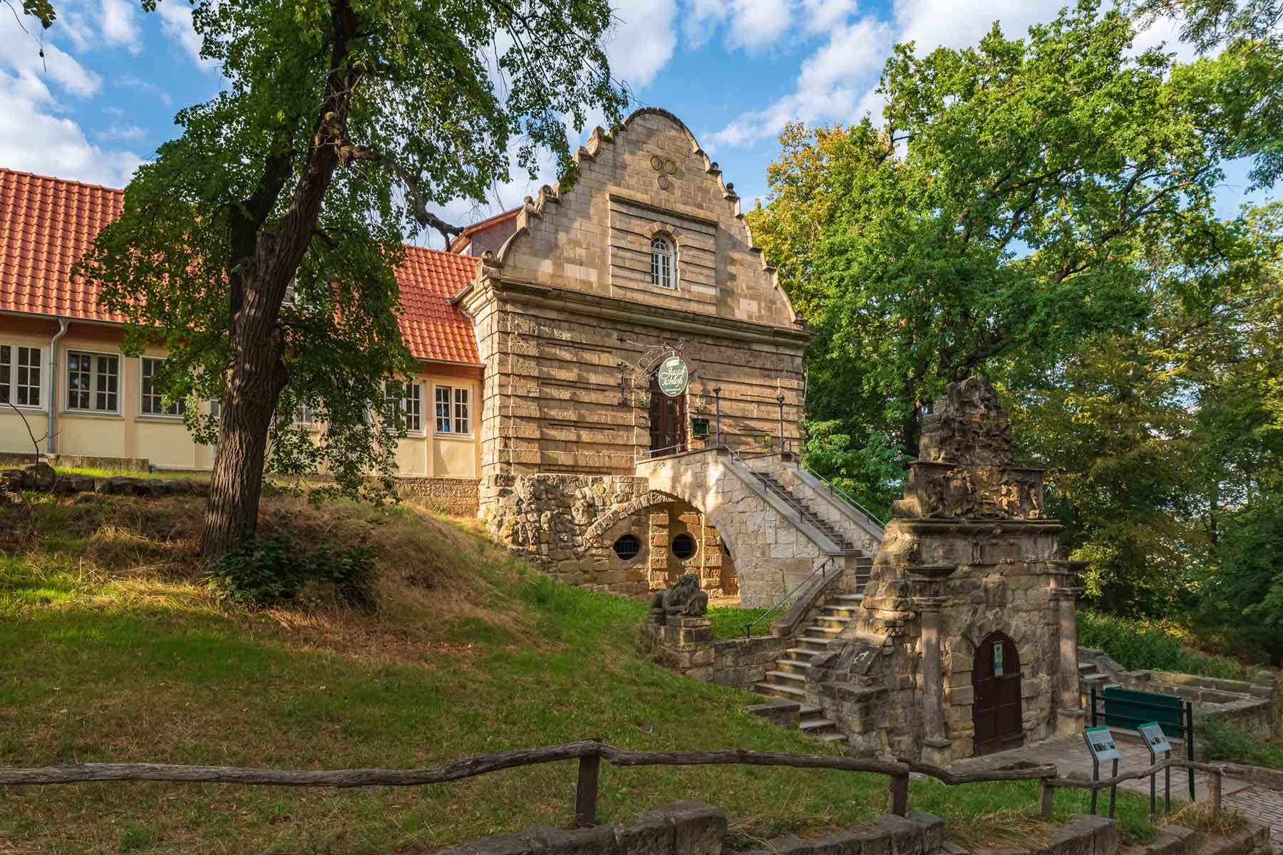 即使在 250 多年后的今天,哈尔伯施塔特仍以其出色的公园建筑,包括茂密的森林、色彩斑斓的草地、阴森恐怖的丛林洞穴和蜿蜒曲折的小路,给年轻人和老年人留下了深刻的印象。公园内的主要建筑至今仍保存完好,其中包括美景宫(Belvedere)瞭望塔、冯-斯皮格尔-祖-迪森伯格男爵陵墓、冬宫和带有顶级巨型酒桶的狩猎小屋。这个酒桶的容量达到了令人难以置信的 144 000 升,甚至在 2008 年被载入了吉尼斯世界纪录。狩猎小屋的露台建于 1782 年,尤其令人印象深刻--从这里可以欣赏到哈尔伯施塔特的独特全景。