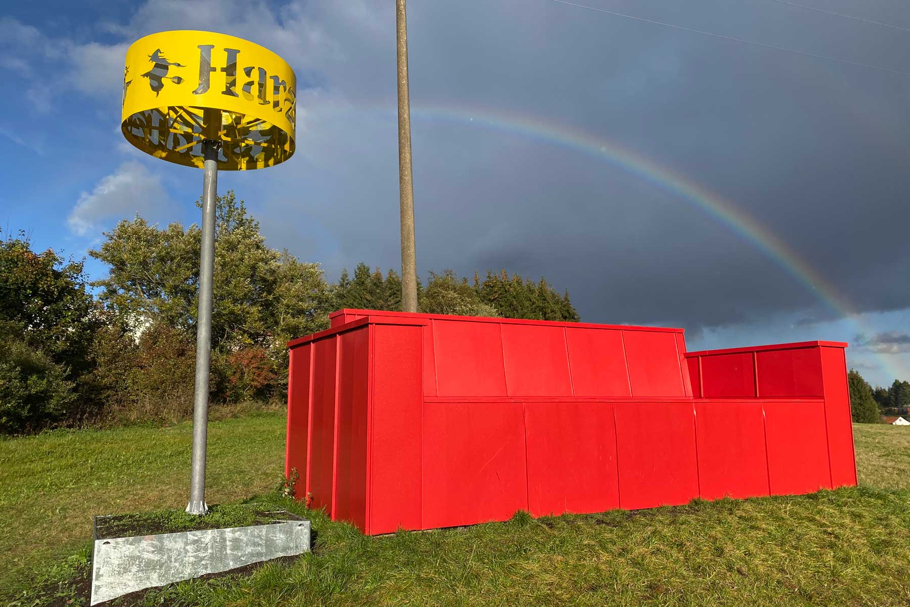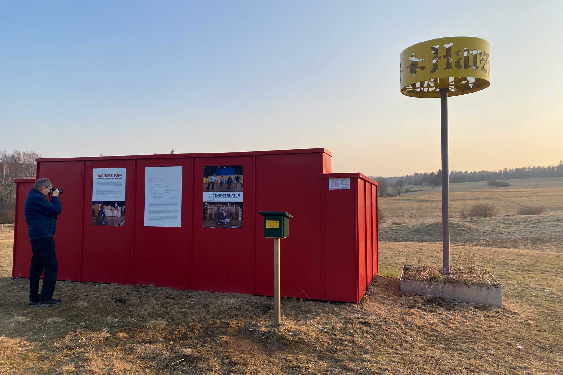自 2014 年起,每年八月由哈尔茨文化协会(Kulturrevier Harz e.V.)主办的 "2019 年戏剧节"(THEATERNATUR FESTIVAL 2019)都会在本内肯施泰因的瓦尔德布恩(Waldbühne)上演一系列精彩的内部演出、客座表演和文化活动。在 2019 年上演的话剧《烦恼与痛苦的传说》中,戏剧性的场景就发生在超大沙发上。如今,身着红色长袍的沙发更吸引人流连忘返。沙发最初是作为艺术节的道具设计的,现在它找到了新的用途--作为艺术装置和艺术与自然的象征,任何想要体验这一地区美景的人都可以使用它。