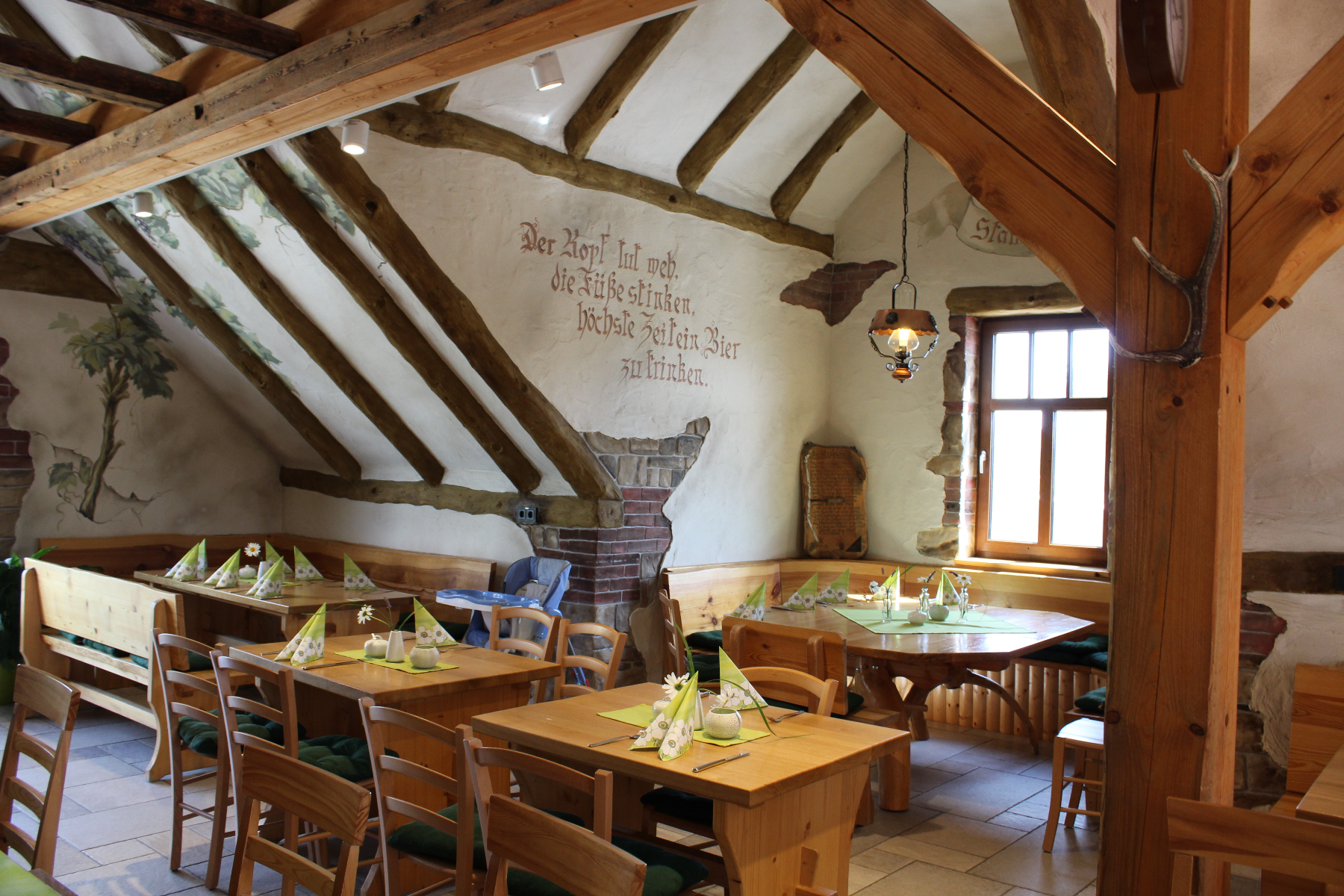 餐厅的氛围舒适而质朴,墙上挂着的许多美好的格言和图片会让您心跳加速!众所周知,欢笑有益健康!